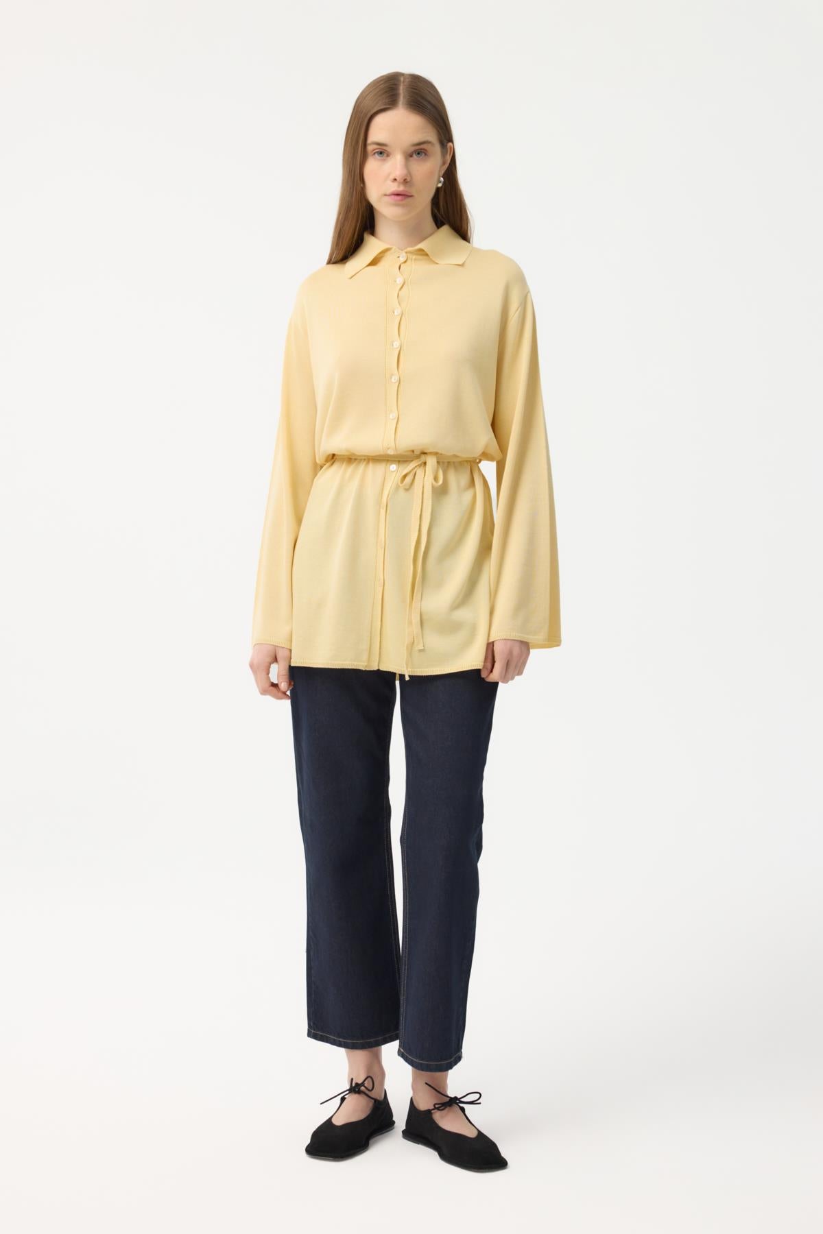 The Button Front Lightweight Knit Cardigan is crafted from a viscose blend knit with a silky touch and lightweight feel, creating an elegant look. Designed with a classic collar for a timeless appeal, the cardigan features batwing sleeves that add a modern and relaxed silhouette. The detachable piping belt allows you to adjust the fit and highlight the waist, giving the tunic-length cardigan a refined and versatile shape.