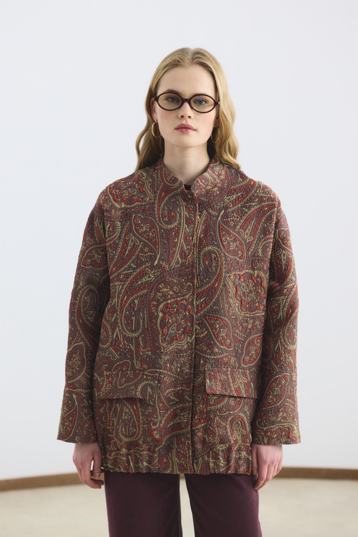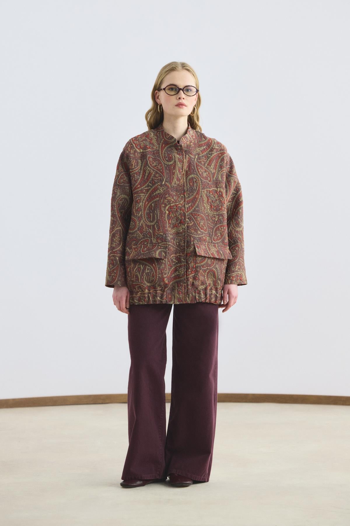The Patterned Jacquard Bomber Jacket is crafted from specially woven jacquard fabric, adding distinctive texture and strong character to your style. Its stand collar and concealed snap-button closure create a clean and modern silhouette. The elasticated hem ensures a comfortable fit that adapts to the body, while functional side pockets enhance everyday practicality.