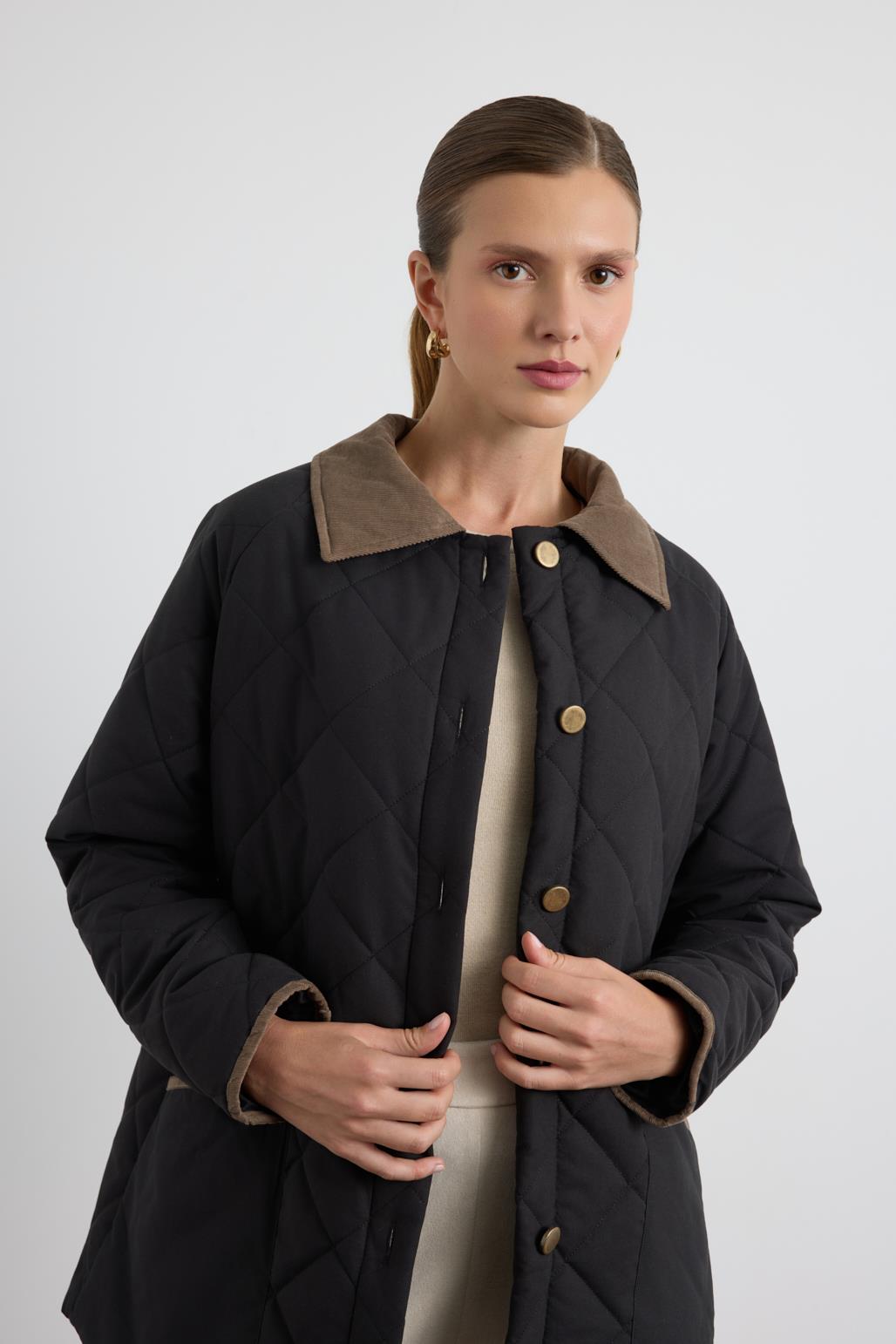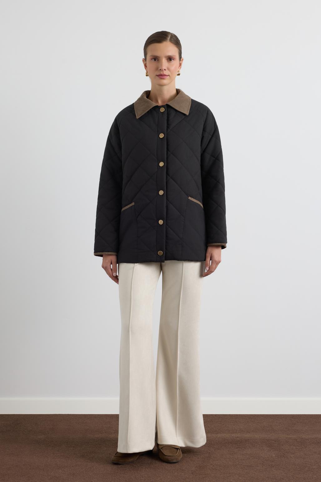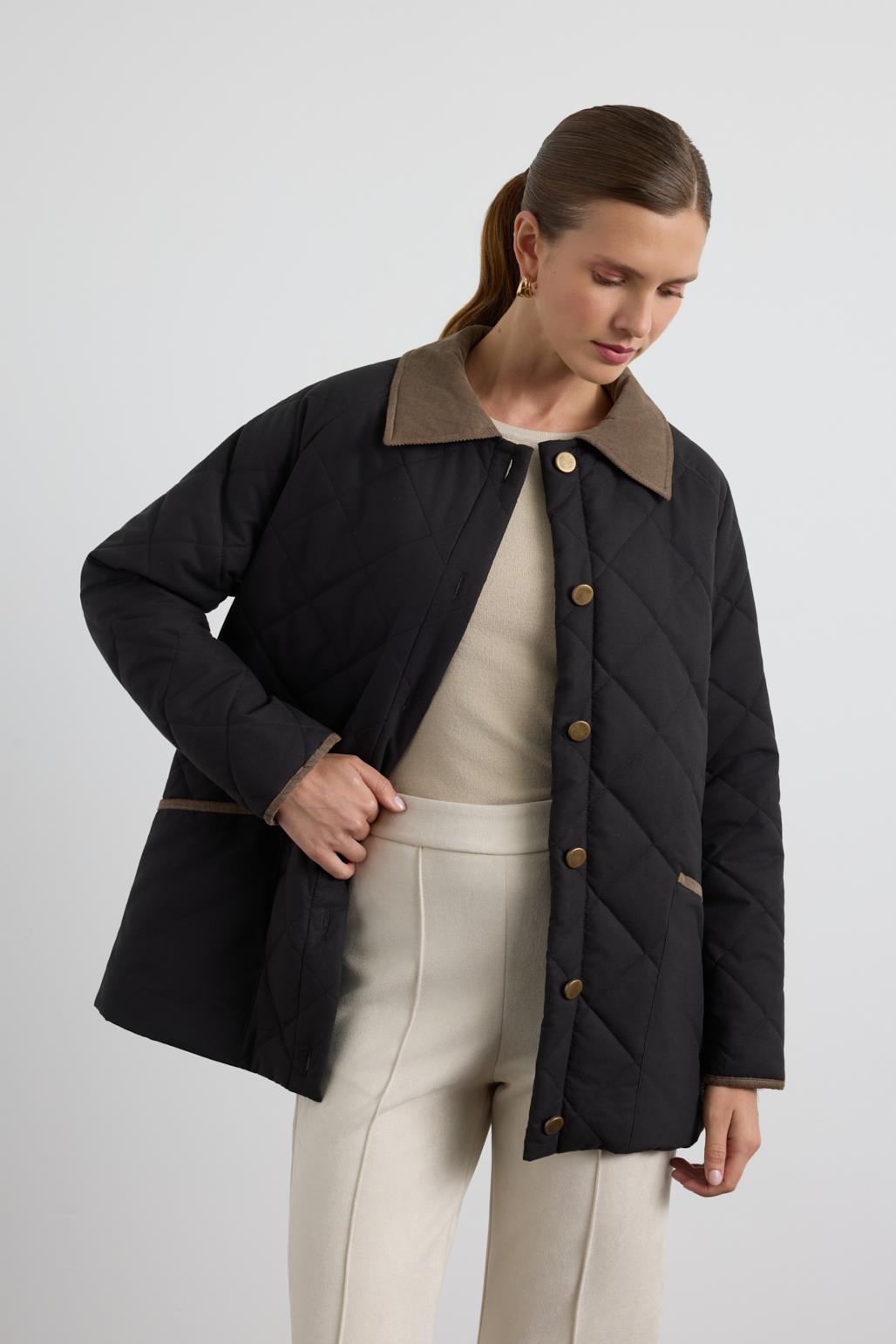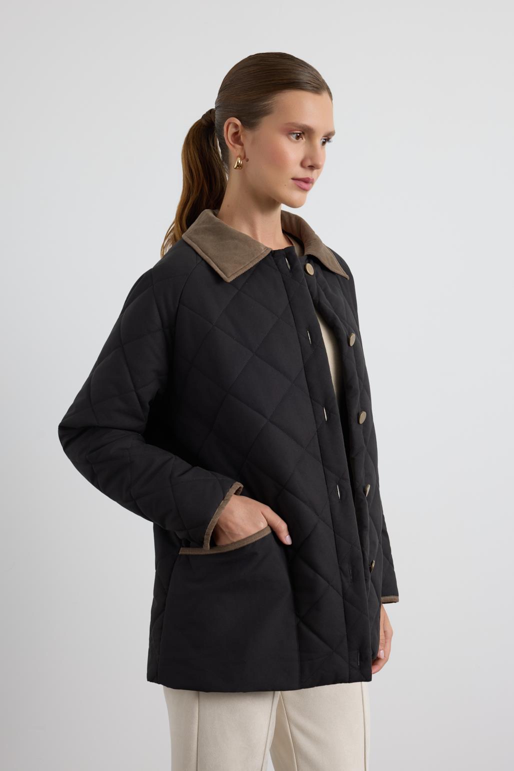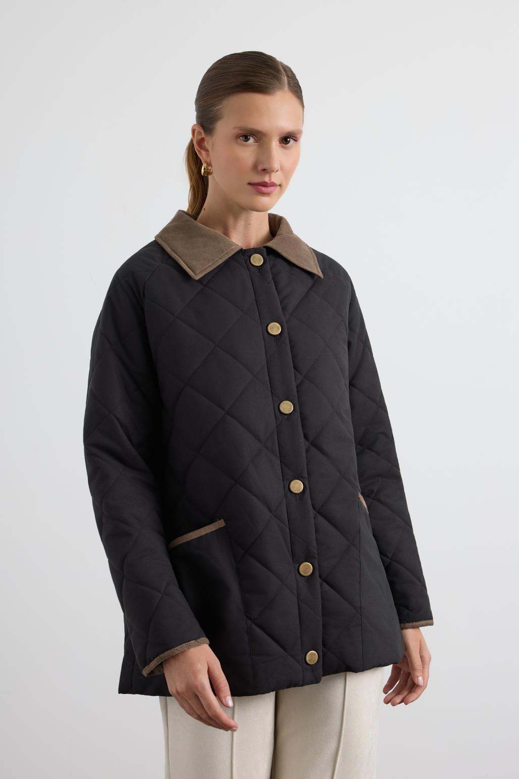 The Velvet Collar Quilted Jacket combines style and functionality with its diamond-patterned quilted filling. Made from a PS and cotton blend fabric, the jacket features a velvet collar and piping details for an elegant touch. Its wide pockets provide practicality for everyday use, while the lined interior keeps you warm during cooler days. The button closure adds a classic and refined finish to this versatile piece.