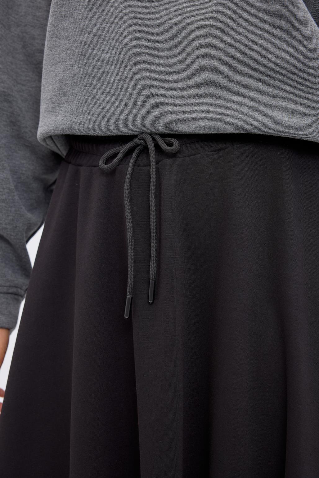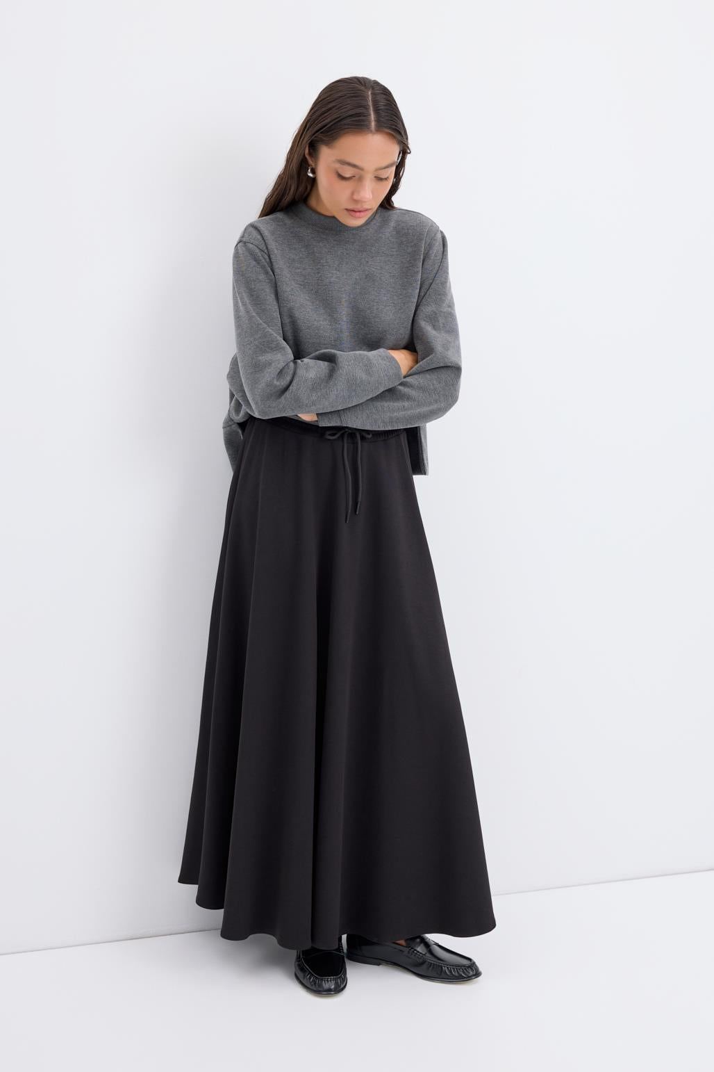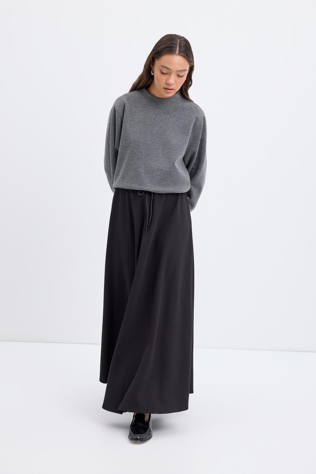 The High Waist Tie Waist Flared Skirt is crafted from double-face interlock fabric, offering both comfort and elegance. Its full elasticated high waist and adjustable drawstring provide a perfect fit, while the wide silhouette and flared cut allow ease of movement with a graceful look. Designed to complement both casual and special outfits, this skirt is a versatile piece that brings effortless sophistication to your wardrobe.