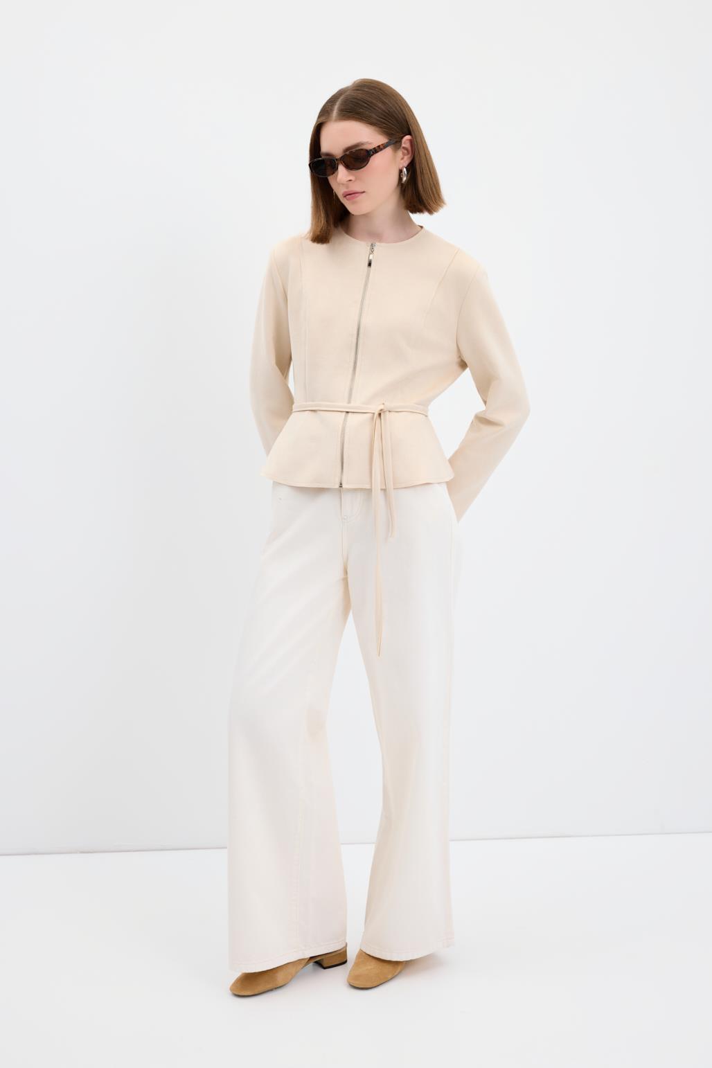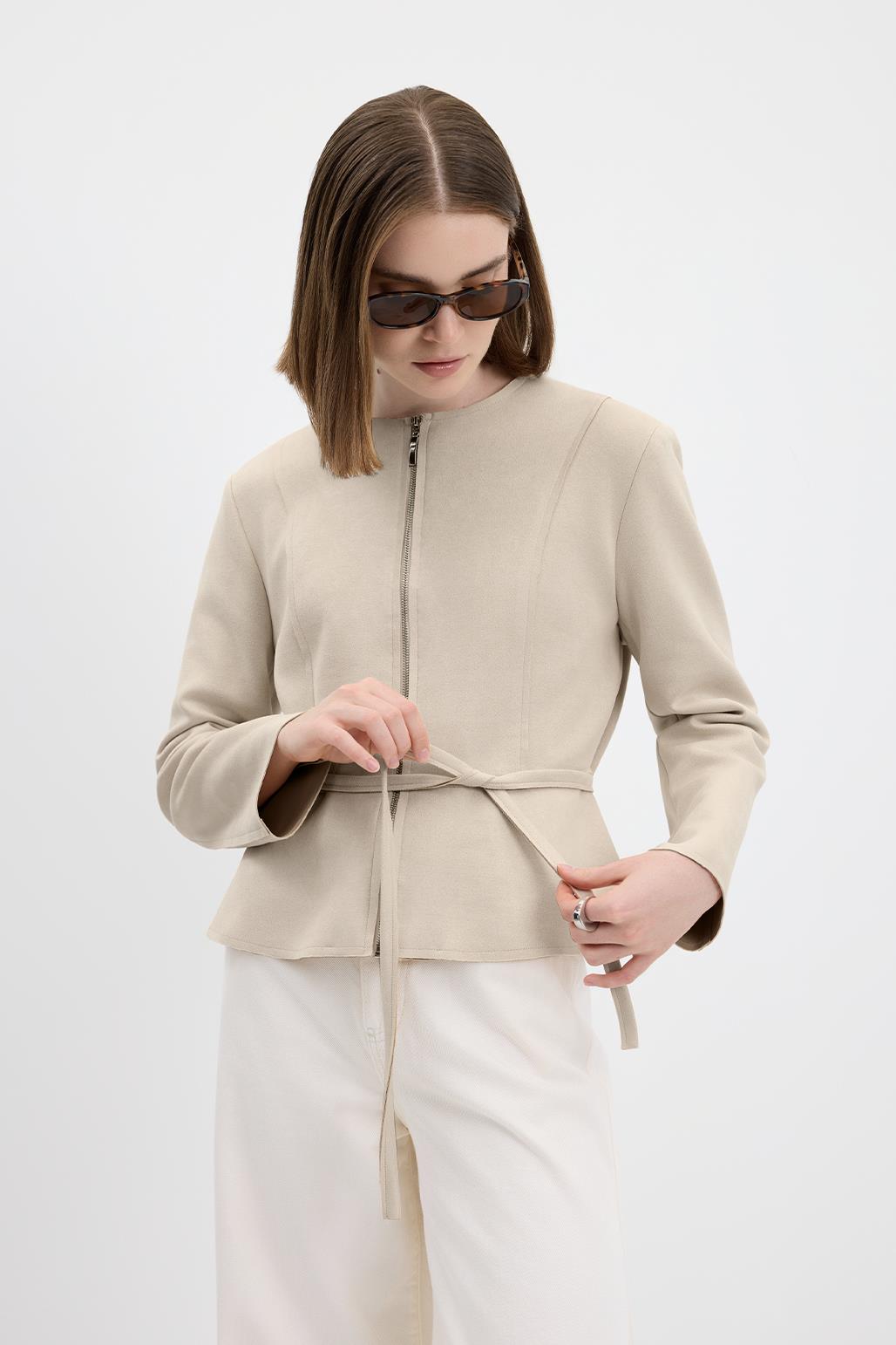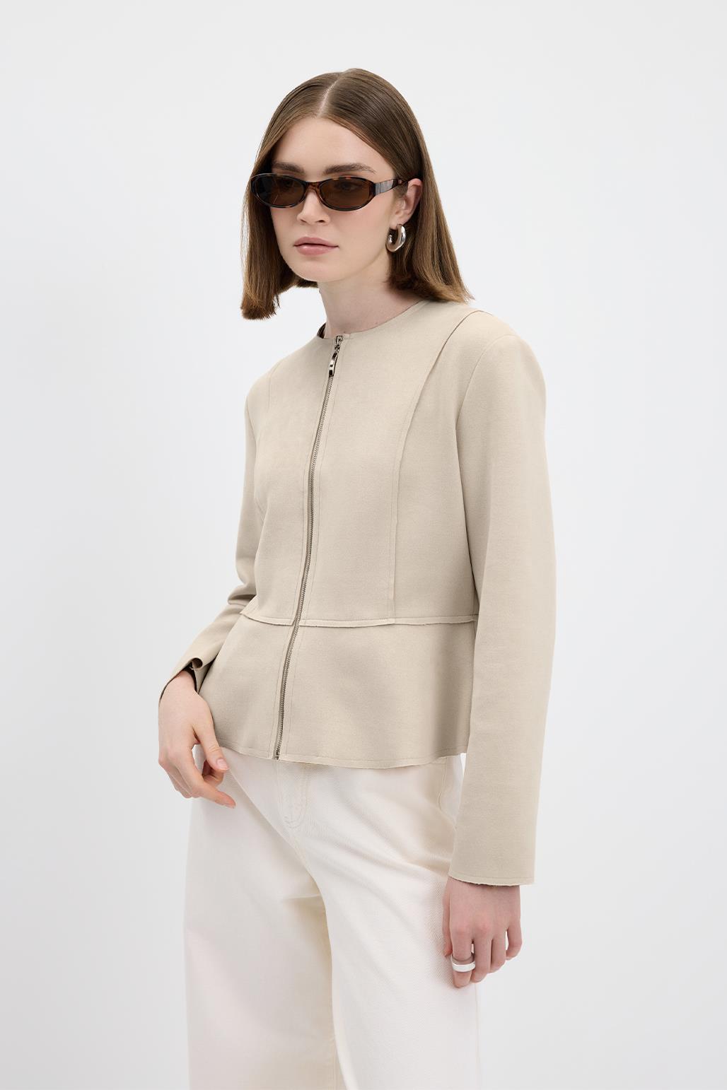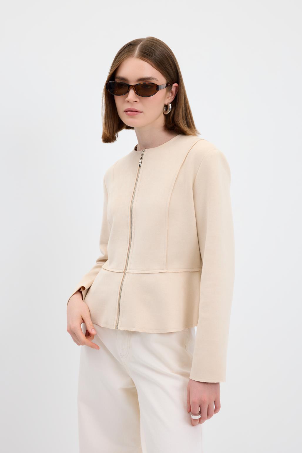 Suede Short Jacket with Zip Up Crew Neck Beige