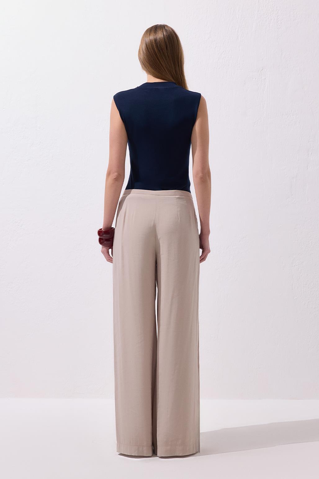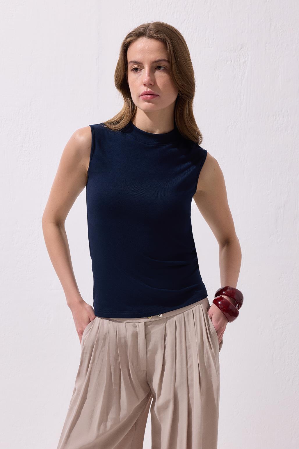 The Sleeveless Stretch Cotton Top in Navy Blue offers comfort throughout the day with its soft and lightweight fabric. The round neck and sleeveless design create a chic yet practical option. Its breathable fabric ensures comfort without causing sweating, while the form-fitting style elegantly completes your look. You can wear it under dresses or shirts during warm summer days or cool evenings to add a stylish touch. This basic piece can easily be paired with skirts or trousers, making it a versatile wardrobe essential. It will become a favorite for those seeking both comfort and style this season!
