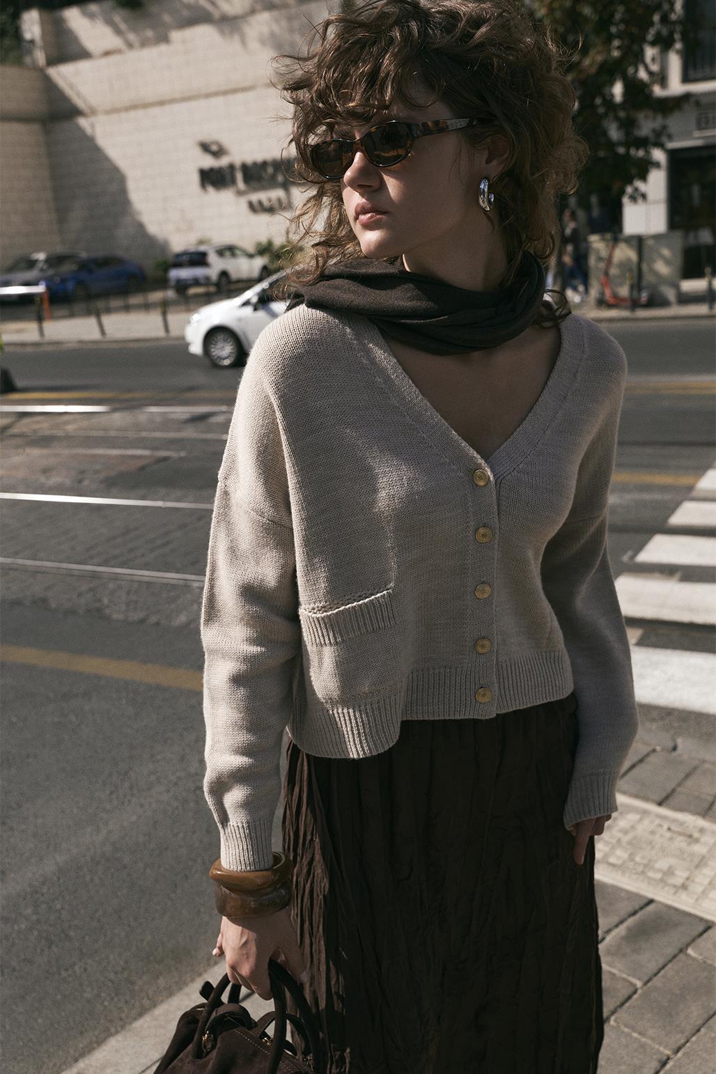 The Knit Cardigan with Gold Buttons offers all-day comfort with its soft and lightweight acrylic knit. Its open V-neck design is perfect for layered outfits, while pocket details and gold-tone buttons add a subtle, elegant touch to the simple design. The ribbed hem and cuffs maintain their shape, providing a polished look. A functional piece that effortlessly complements both casual and office styles.