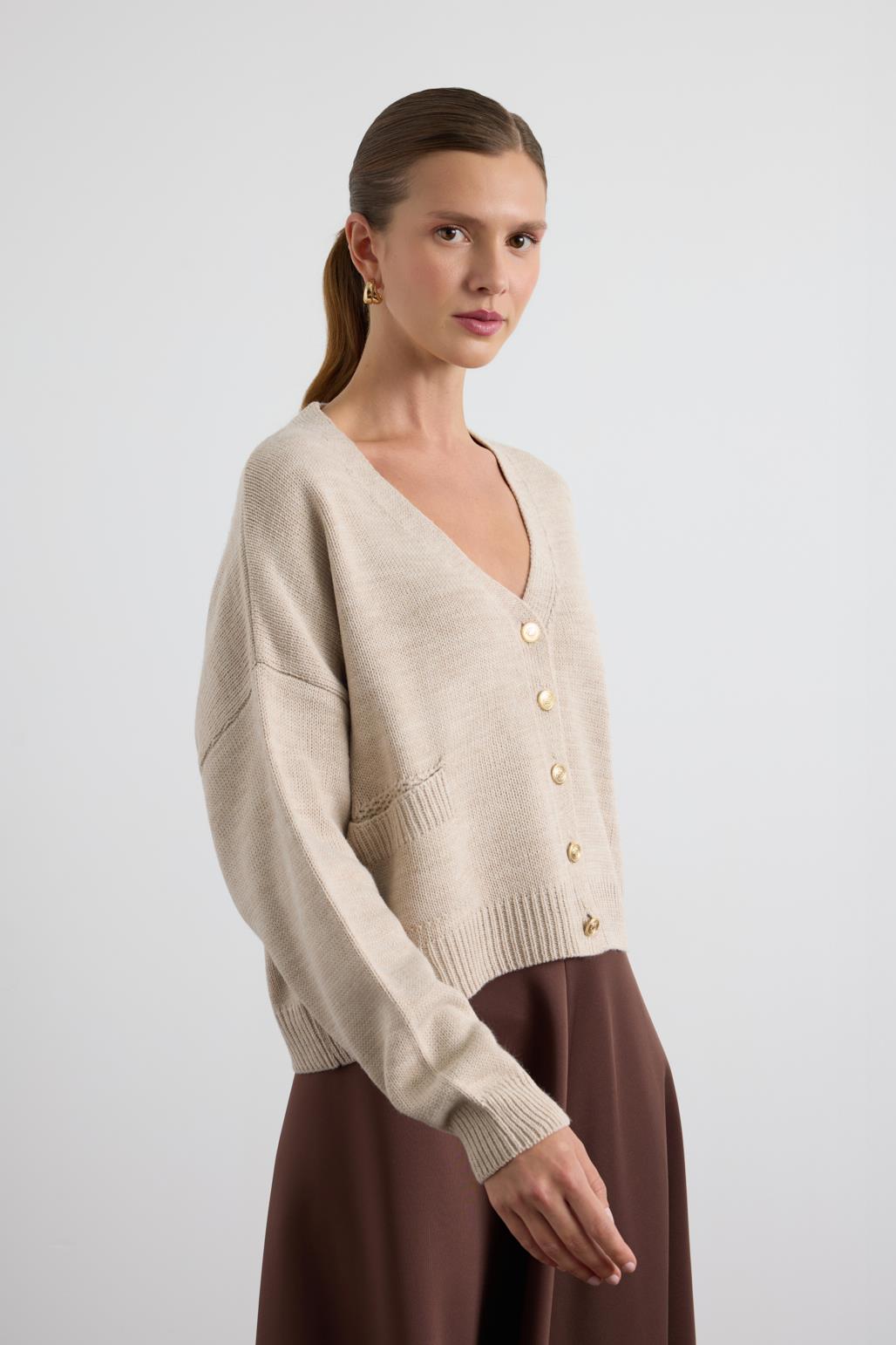 Knit Cardigan with Gold Buttons Stone