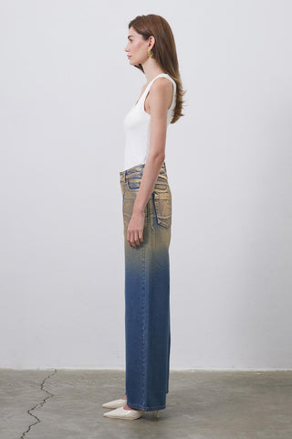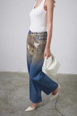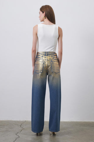 Shiny Print Patterned Palazzo Denim Trousers Gold