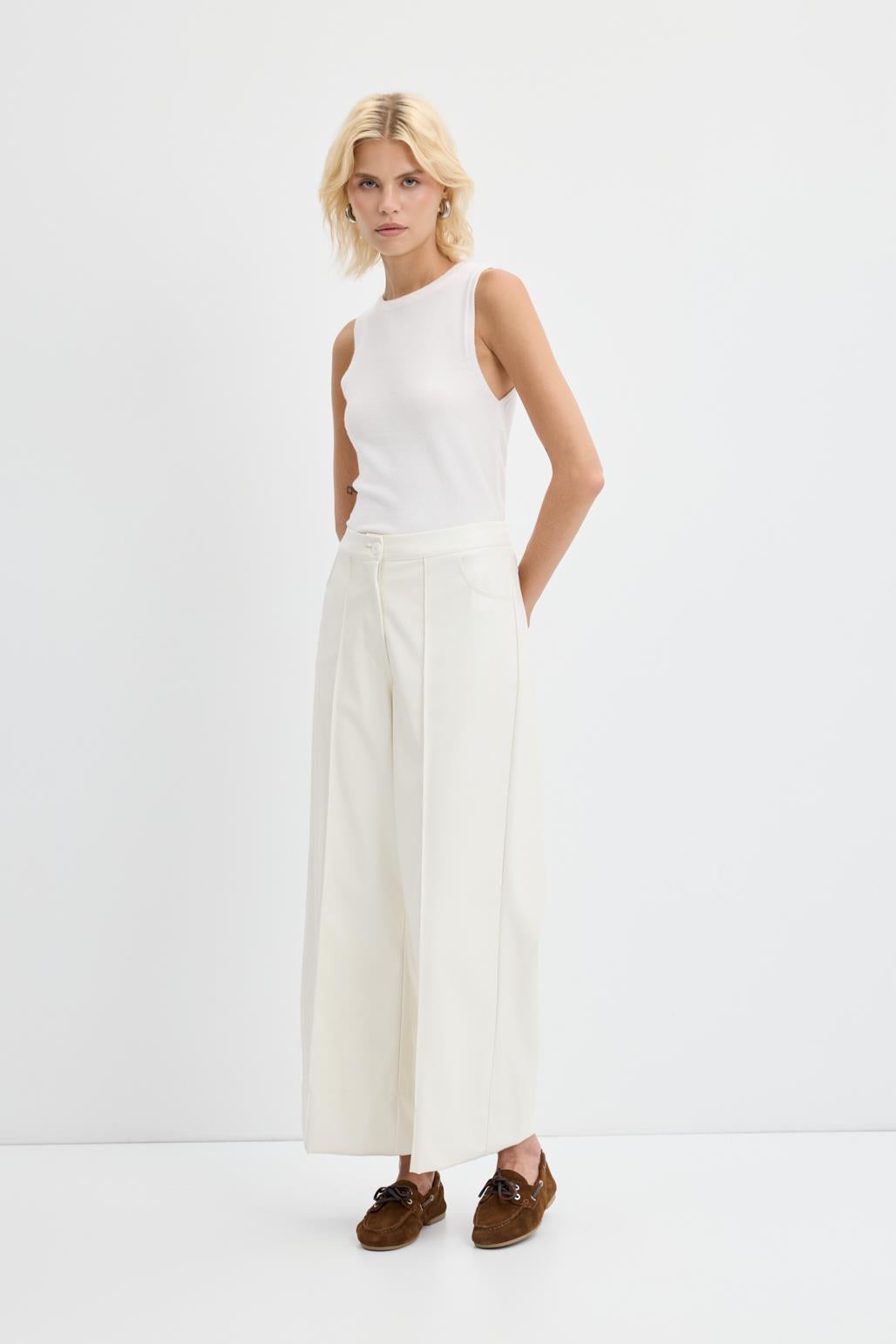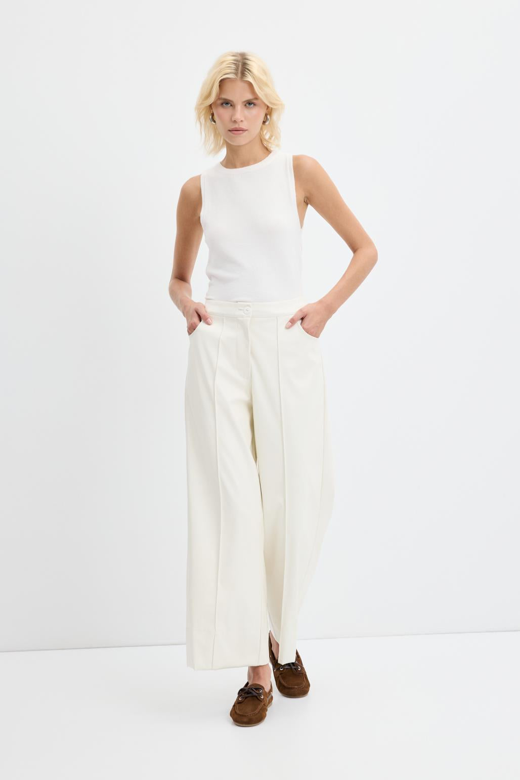 The High Waist Pleated Stitch Leather Trousers offer a modern and confident look with their faux leather fabric. The high-rise waist flatters the silhouette, while the front seam stitching adds structure to the design. Featuring a zipper closure and functional pockets, these pants provide everyday practicality. A bold yet minimal piece that adds an edge to your wardrobe.