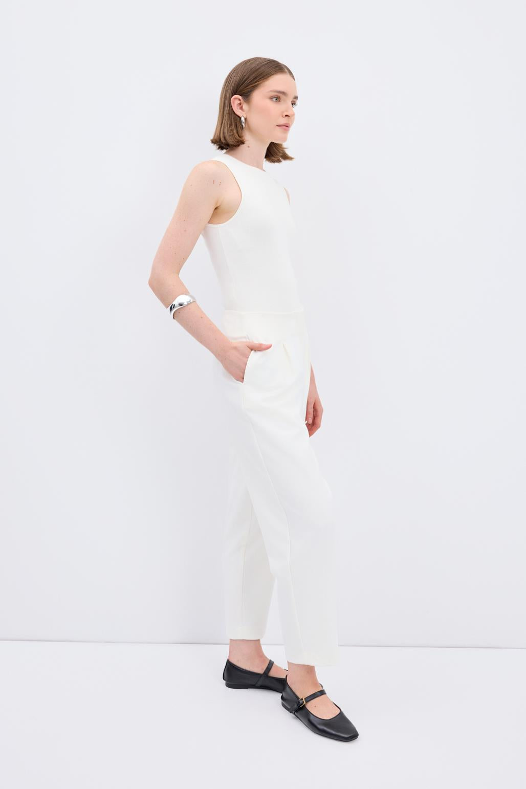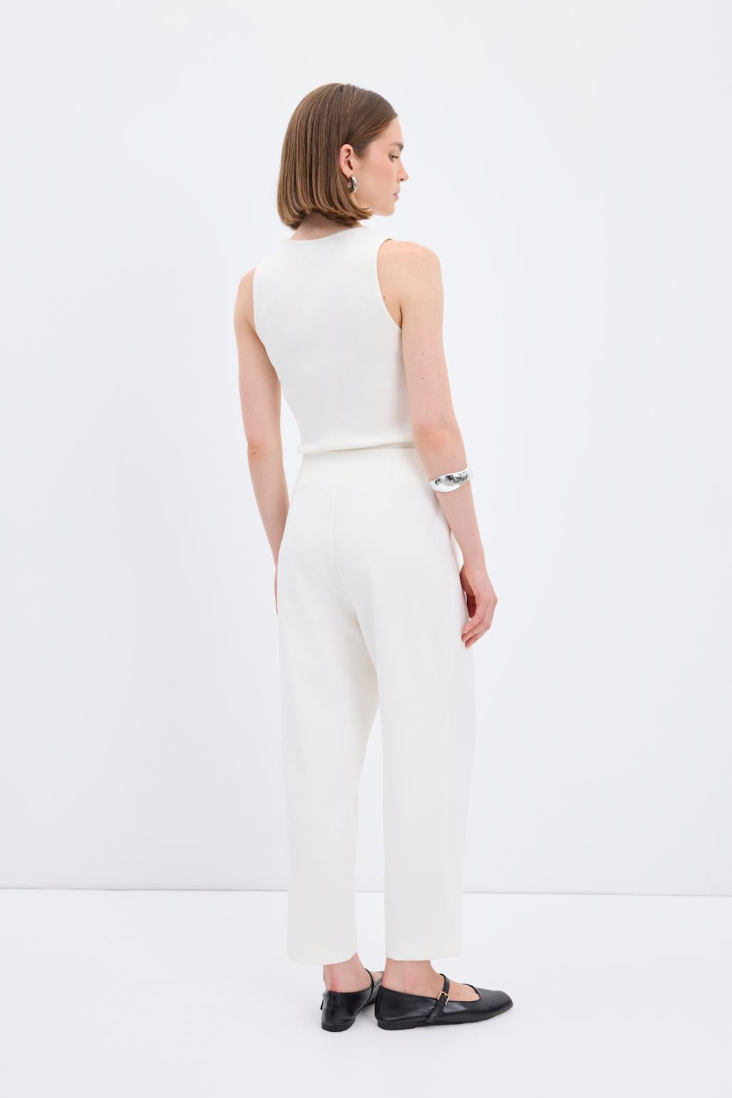 High Waist Straight Crepe Trousers Ecru