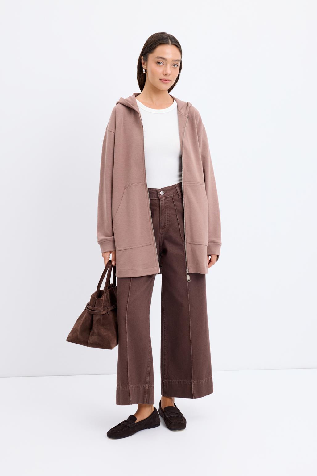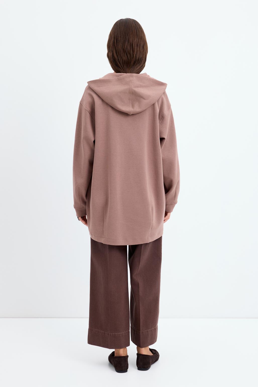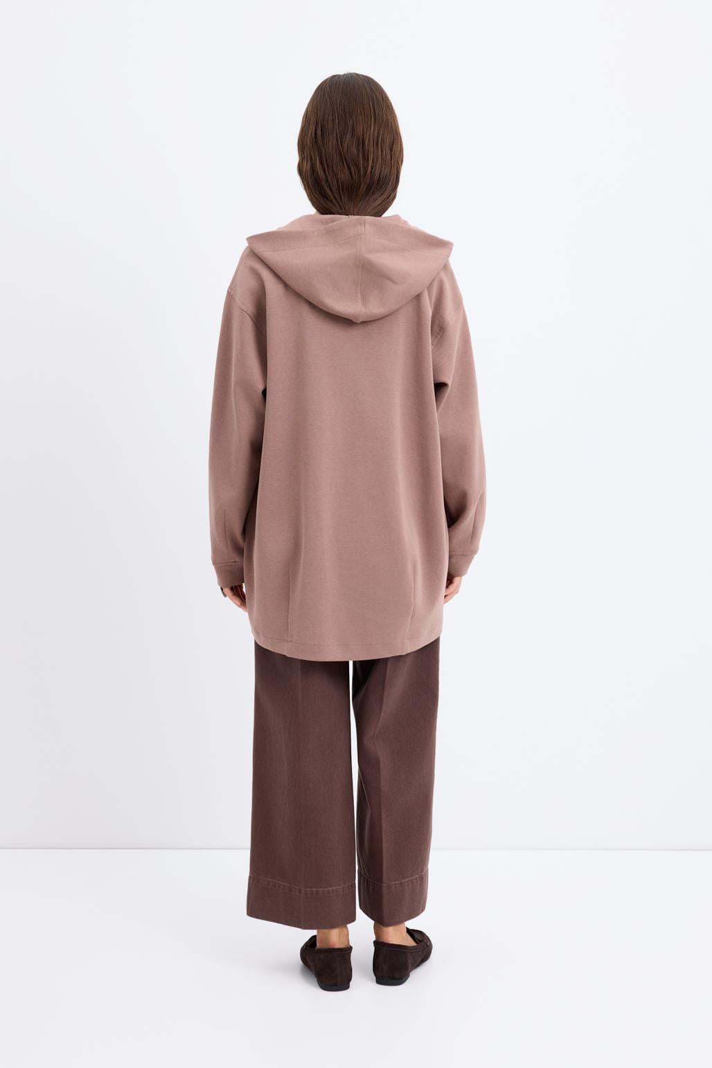 The Zippered Kangaroo Pocket Cardigan is made from soft double-face interlock fabric, offering both comfort and functionality. The hood and zip closure provide practical all-day wear, while the kangaroo pockets add convenience. Pleat details on the sleeves and hem shape the fit, and the relaxed cut allows freedom of movement. This hoodie is a practical and comfortable piece that complements your everyday style.