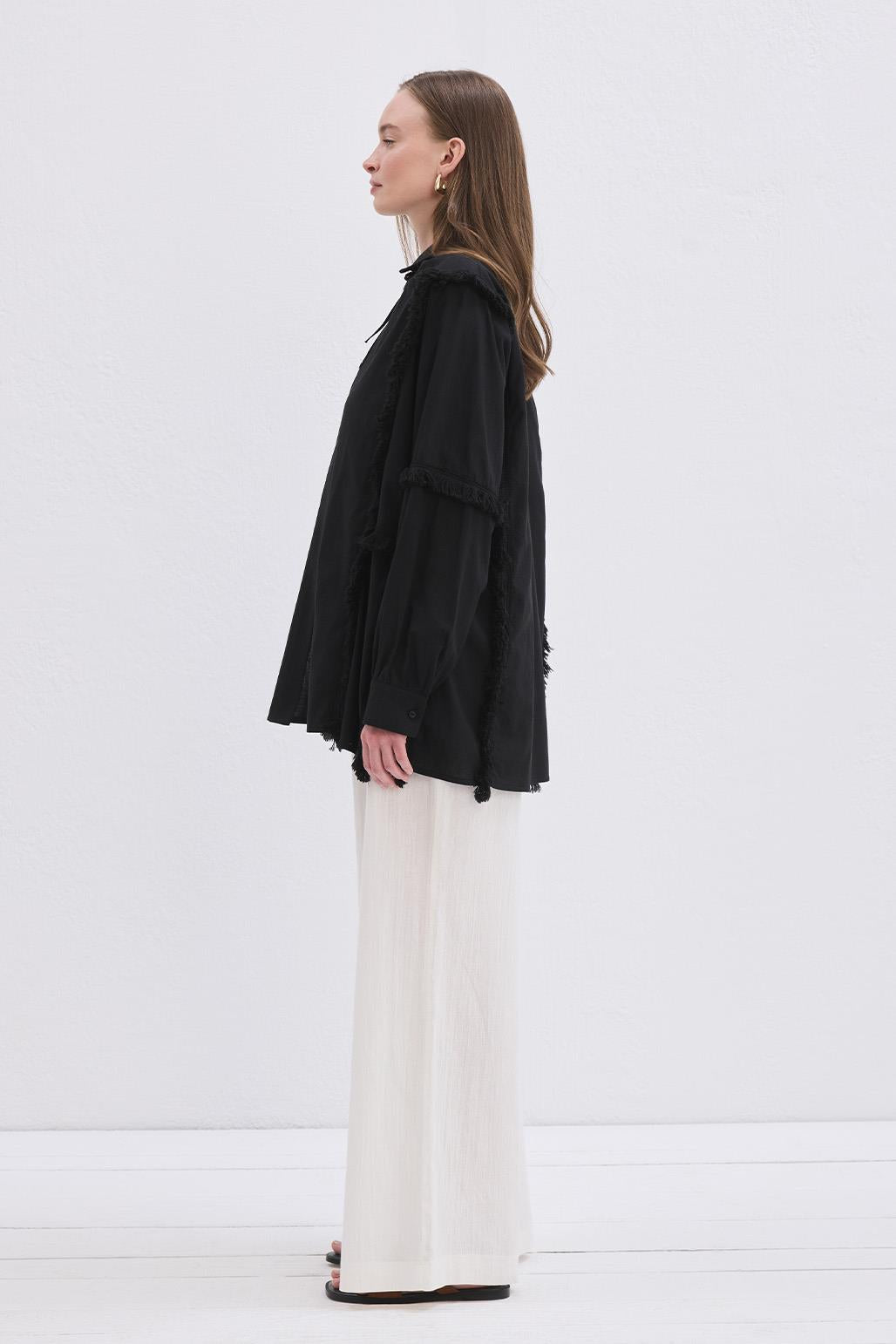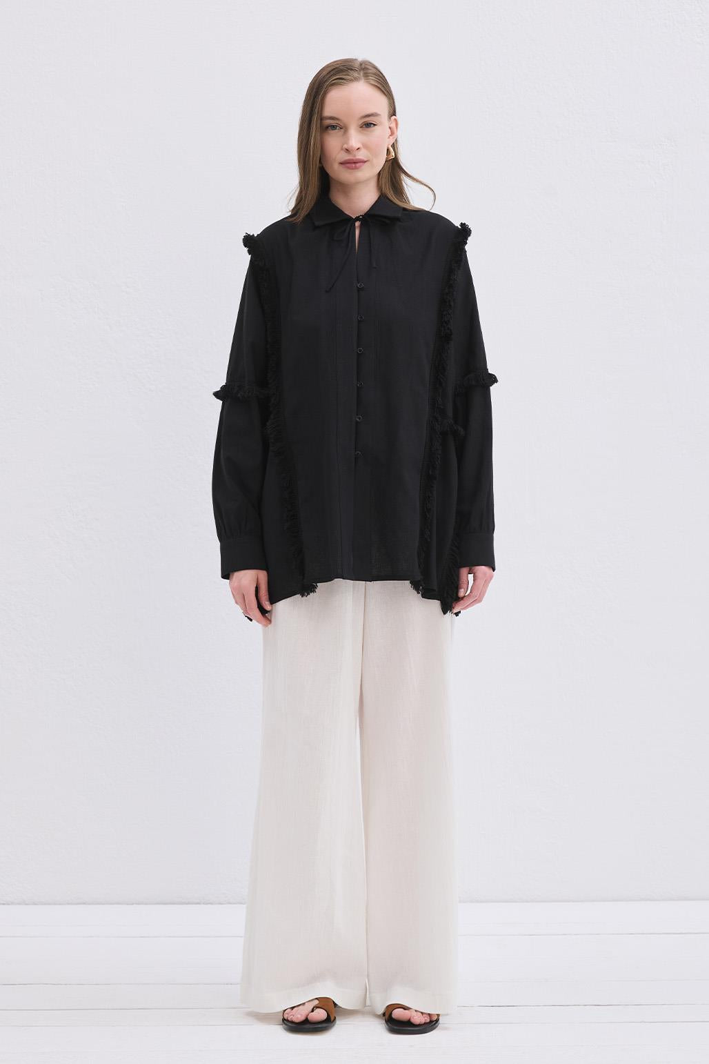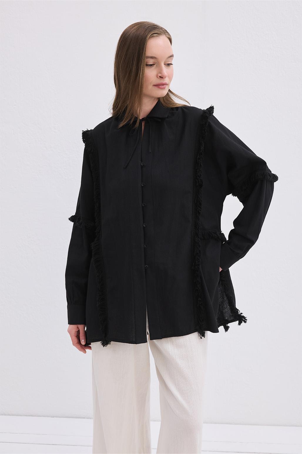 The Doria Fringed Linen Shirt in Black offers a light, breathable feel and a naturally elegant look with its viscose-blend linen fabric. The classic collar and tab button closure create a clean, minimal appearance, while the side slits and fringe details introduce a subtle bohemian touch. Accented with tone-matching accessories, the design is versatile enough for effortless daily styling or for creating unique summer evening looks. With its timeless silhouette and distinctive detailing, this shirt is a standout piece in any wardrobe.