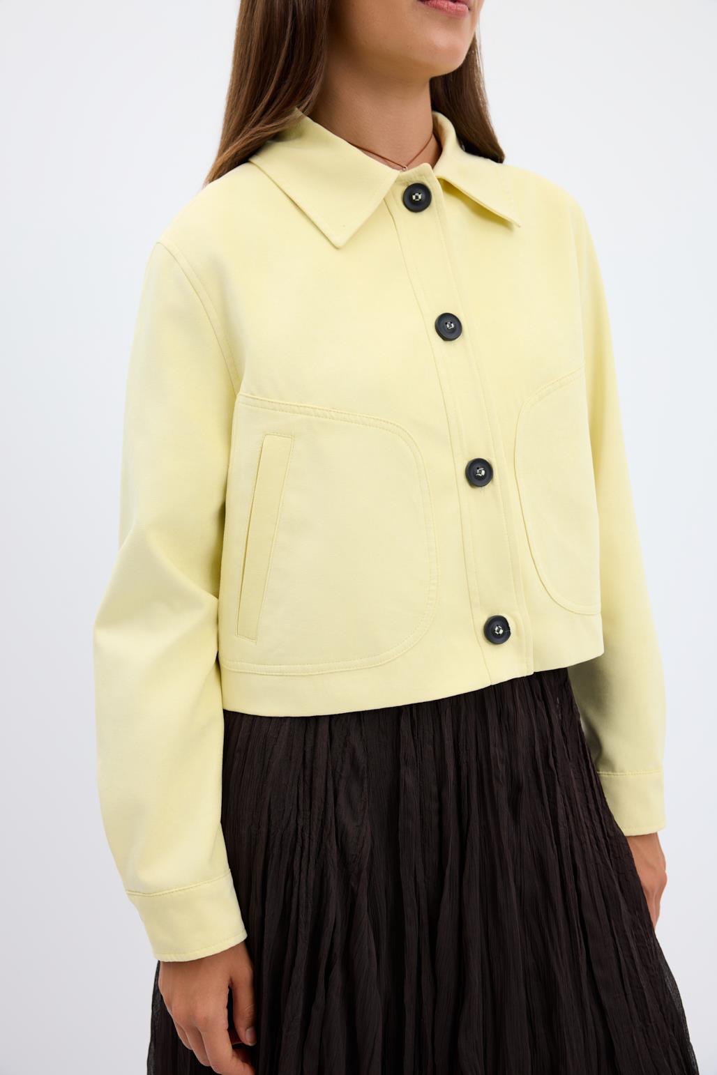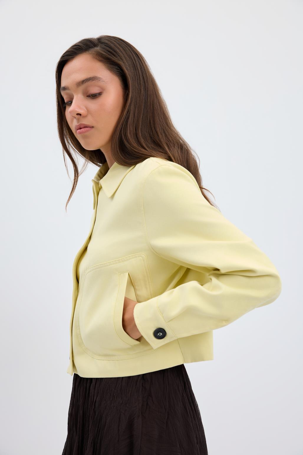 The Suede Short Jacket features a classic collar and suede-look fabric for a simple and stylish appearance. Its front-cut design and straight silhouette create a modern look, while cuffed sleeves and side pockets add functionality for everyday wear. The lined interior provides comfort during seasonal transitions. Finished with a button closure, this jacket is an ideal complement for both simple and more elegant outfits.