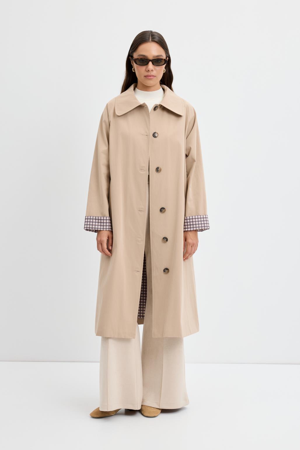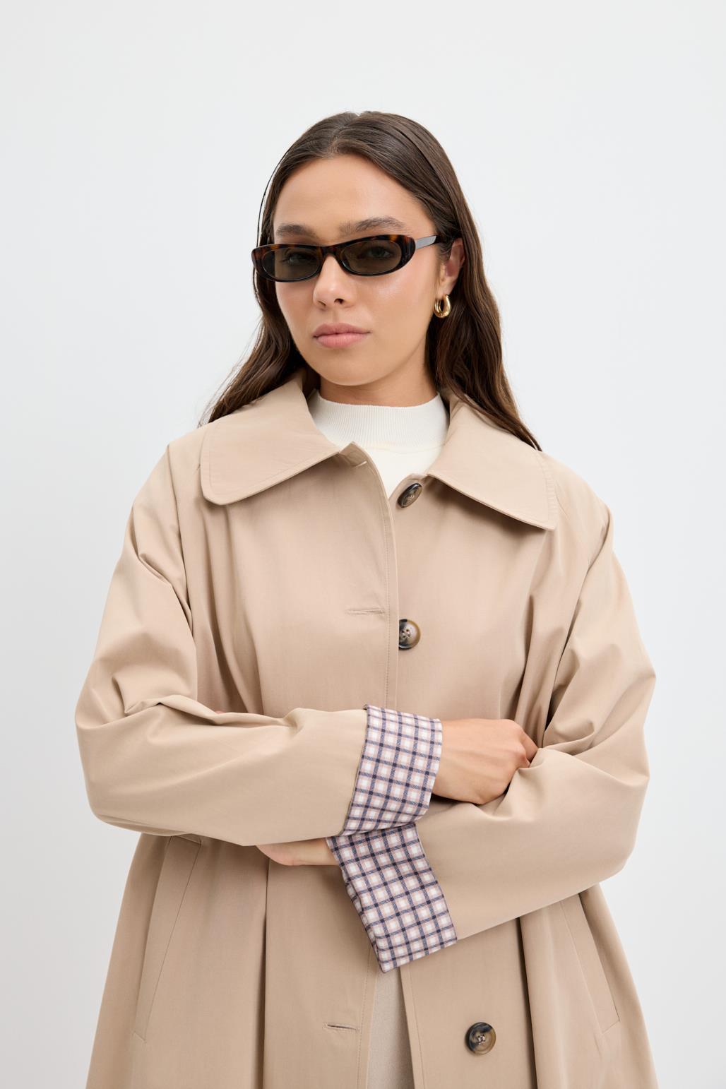 The Checked Belted Long Trench Coat is crafted from a cotton-blend gabardine fabric. Its wide collar and matching patterned lining offer both aesthetic appeal and comfort. A back slit detail at the hem provides ease of movement, while foldable sleeve cuffs allow for practical use. The button closure and detachable belt let you shape the waist as you wish. With its oversized and relaxed cut, it easily complements daily outfits.