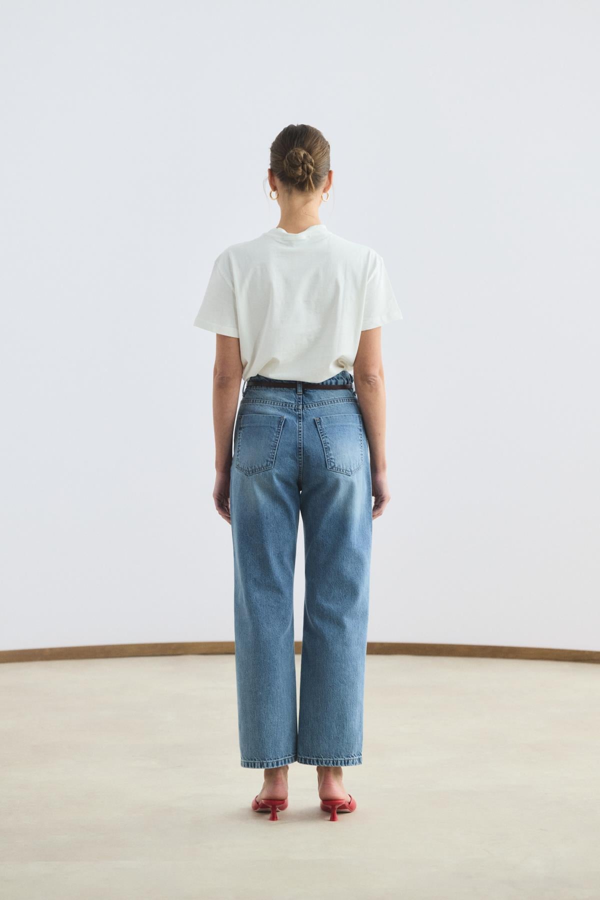 The High Waisted Straight Leg Jeans are crafted from durable gabardine fabric that maintains its shape while providing everyday comfort. The high-rise design elegantly defines the waist, while the straight-leg cut creates a timeless silhouette that visually elongates and balances the figure. Featuring a classic pocketed structure and secure zip closure, this piece offers both functionality and effortless style for daily wear.