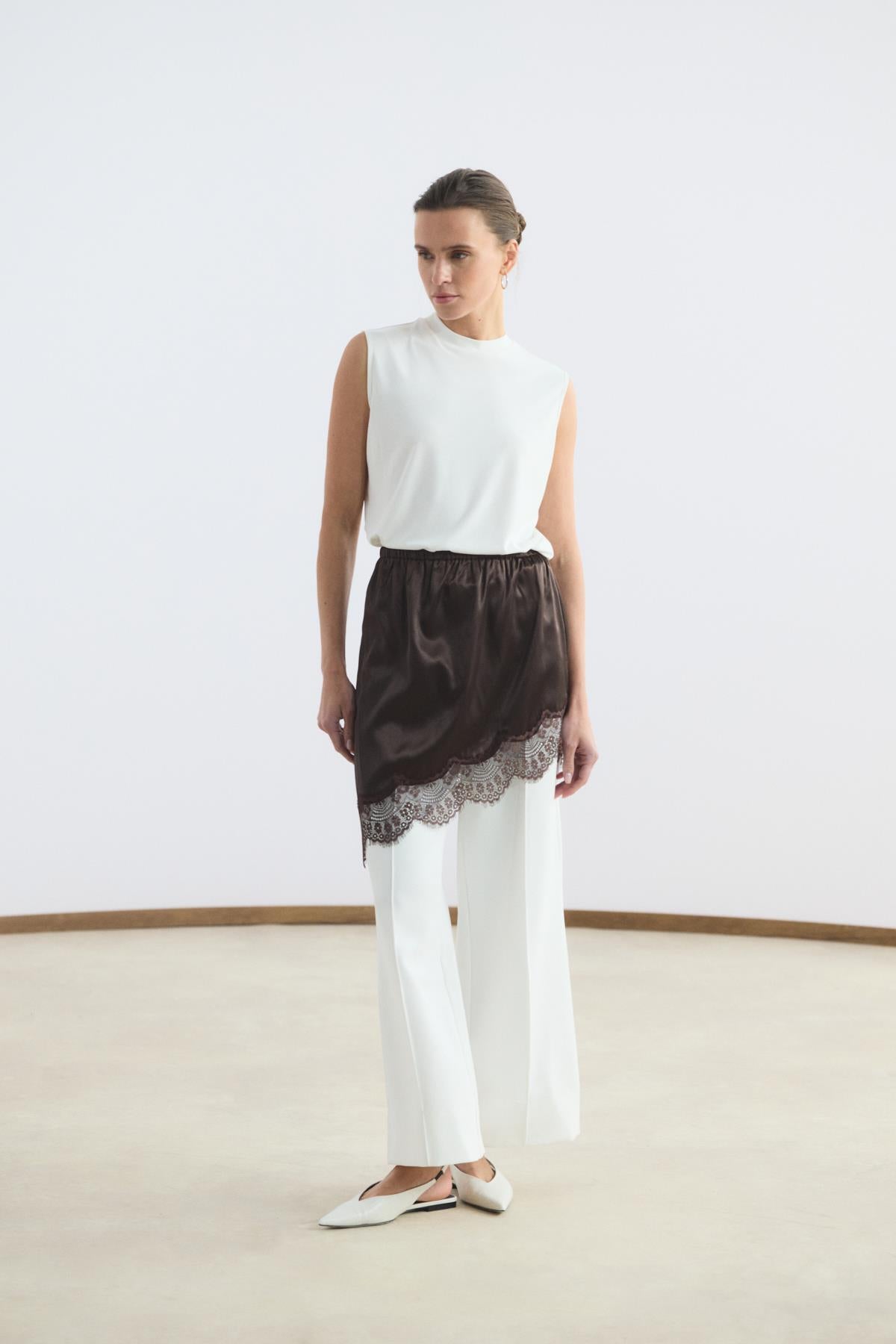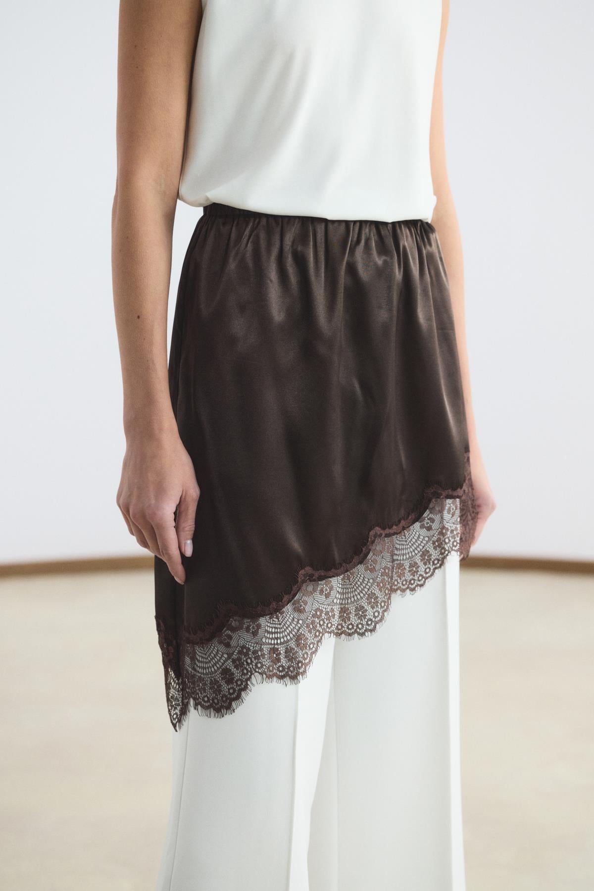 The Lace-Trim Skirt is crafted from smooth and fluid satin fabric, offering comfortable wear throughout the day. The elastic waistband allows for easy dressing and a flexible fit that adapts to the body. Its asymmetric silhouette creates a modern look, while the lace trim at the hem adds an elegant and feminine touch to the design.