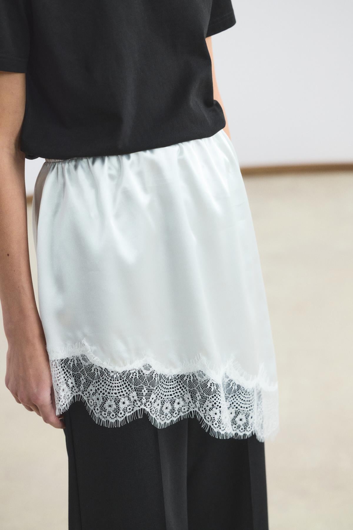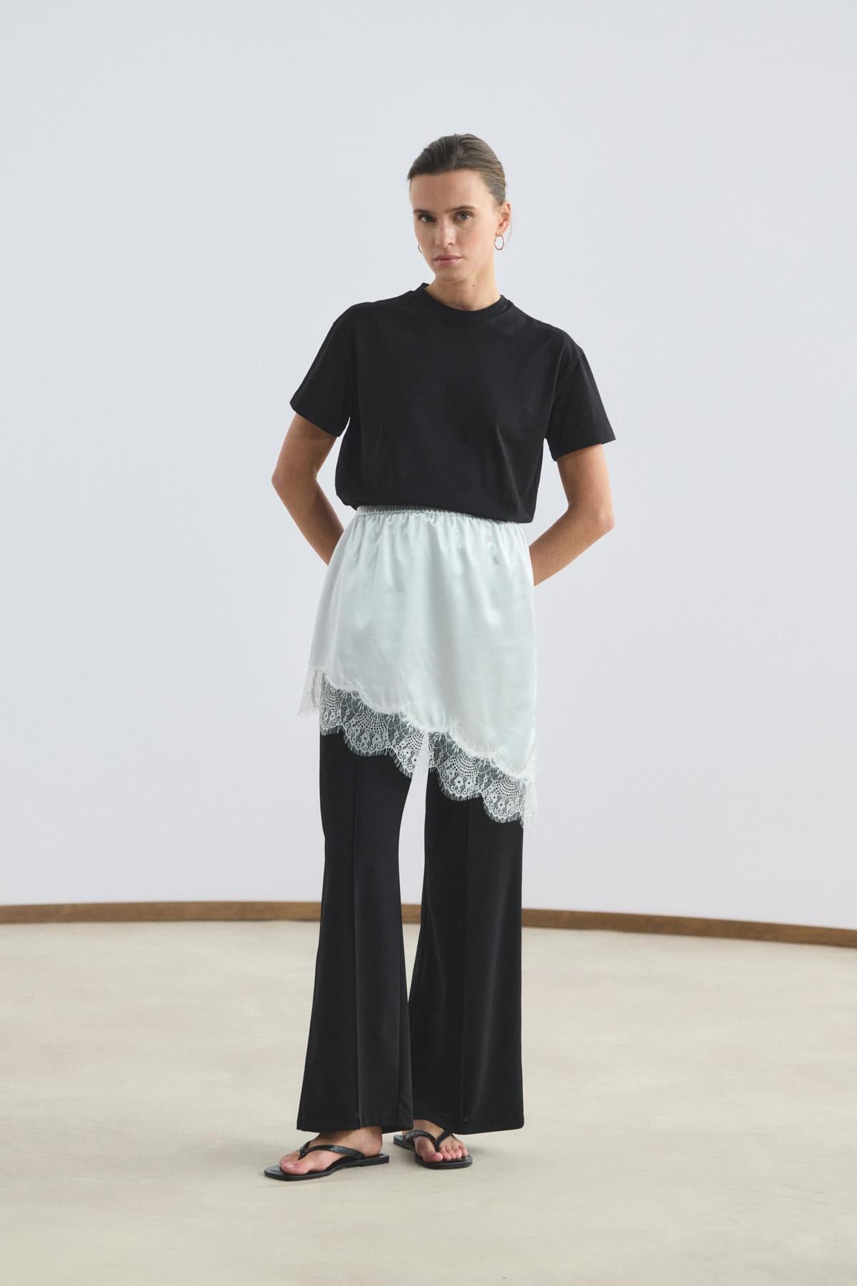 The Lace-Trim Skirt is crafted from smooth and fluid satin fabric, offering comfortable wear throughout the day. The elastic waistband allows for easy dressing and a flexible fit that adapts to the body. Its asymmetric silhouette creates a modern look, while the lace trim at the hem adds an elegant and feminine touch to the design.