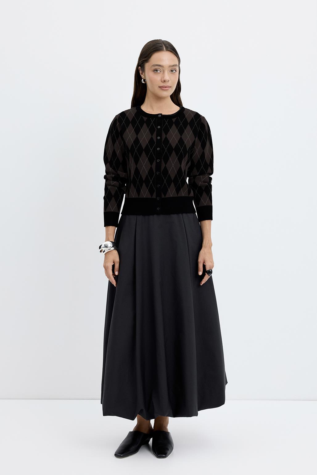 The Round Neck Argyle Knit Cardigan brings a modern twist to a classic pattern, adding style to your wardrobe. Its soft knit fabric ensures all-day comfort, while the round neckline creates a simple and elegant look. The checked pattern makes it versatile to wear alone or layered with other pieces, making it a comfortable yet standout choice for everyday wear and transitional seasons.