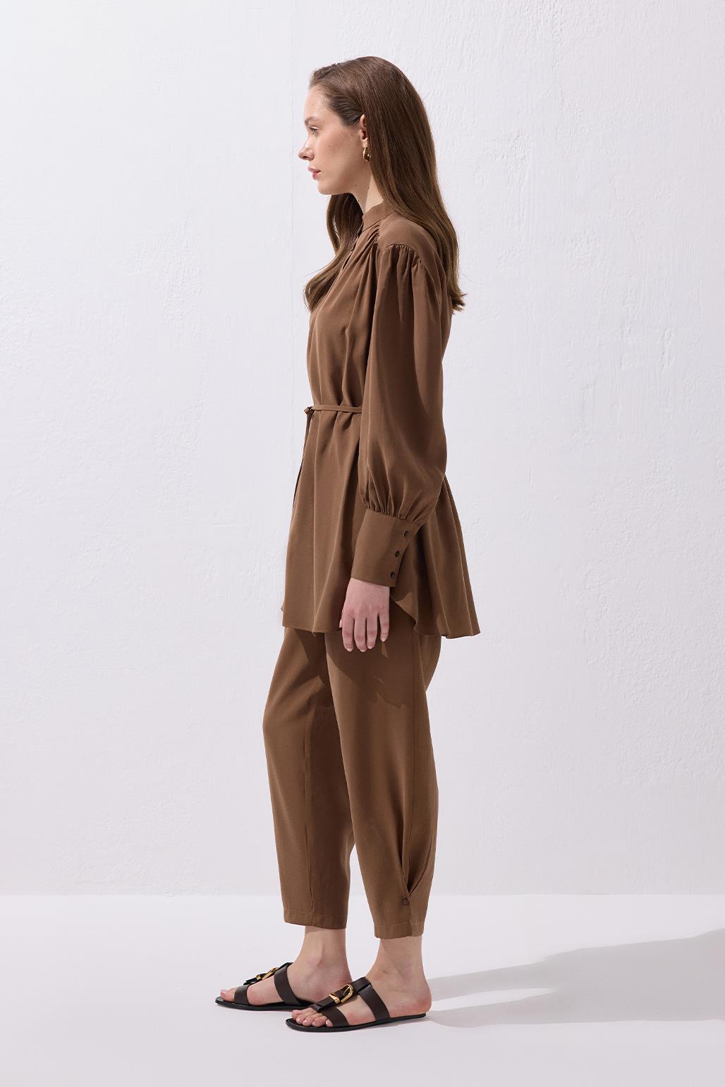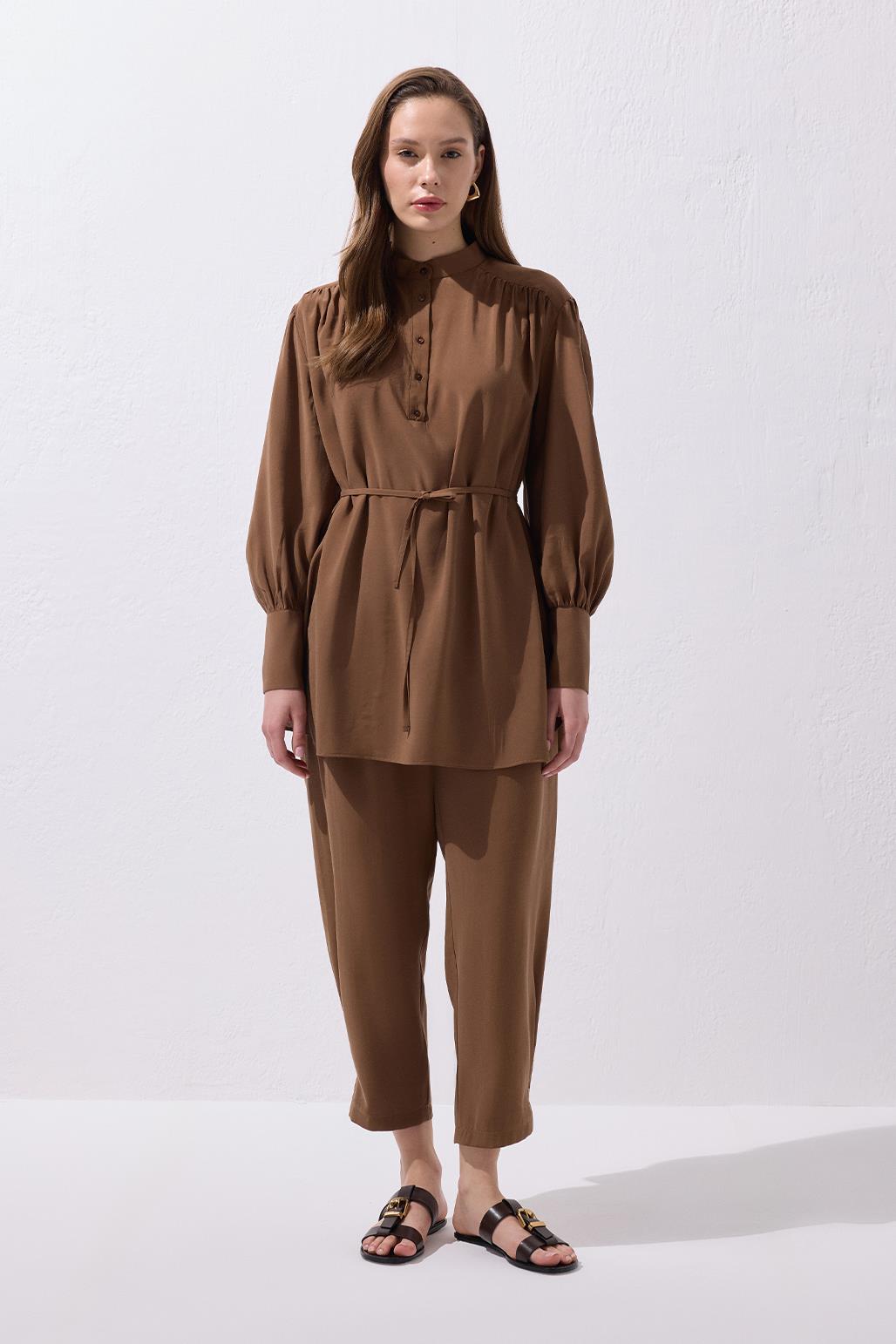 The Tina Shirt and Trousers Set in Brown brings both comfort and effortless style to warm summer days with its flowy modal-blend fabric and refined details. The shirt features a stand-up collar, subtle shoulder gathers, a partial button placket, and wide cuffs that give it a polished, elegant look. The high-waisted pants offer all-day comfort with an elastic waistband at the back, front zipper closure, and buttoned hems that add a tailored touch. Worn together, the set delivers a cohesive, sophisticated outfit. Worn separately, each piece easily adapts to different styles and occasions. Perfect for everything from daily wear to office looks, weekends, and special outings—this set is a versatile staple for your summer wardrobe.