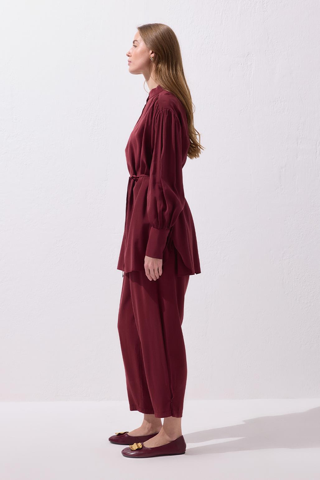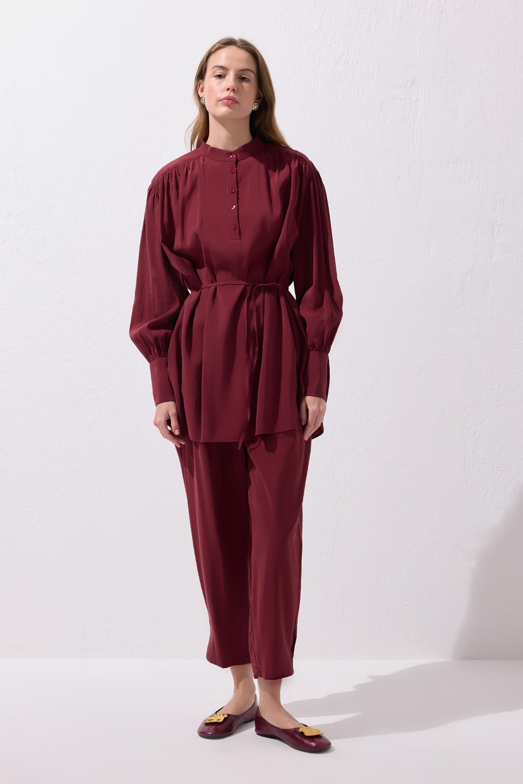The Tina Shirt and Trousers Set in Burgundy brings both comfort and effortless style to warm summer days with its flowy modal-blend fabric and refined details. The shirt features a stand-up collar, subtle shoulder gathers, a partial button placket, and wide cuffs that give it a polished, elegant look. The high-waisted pants offer all-day comfort with an elastic waistband at the back, front zipper closure, and buttoned hems that add a tailored touch. Worn together, the set delivers a cohesive, sophisticated outfit. Worn separately, each piece easily adapts to different styles and occasions. Perfect for everything from daily wear to office looks, weekends, and special outings—this set is a versatile staple for your summer wardrobe.
