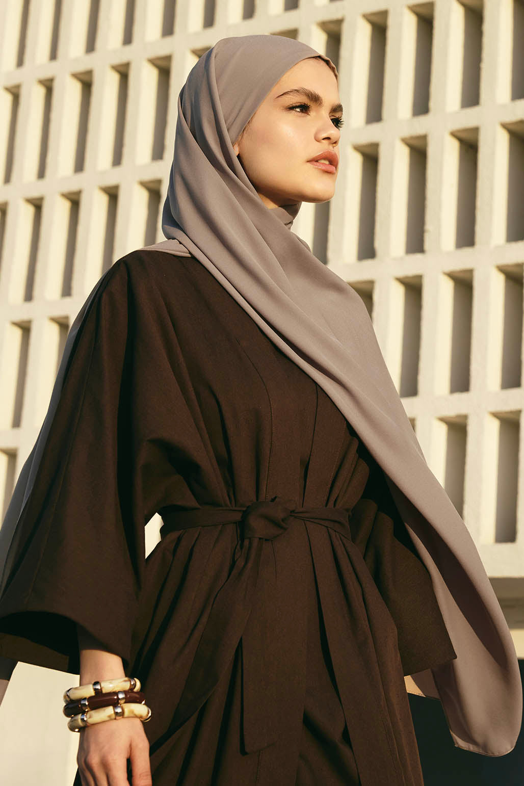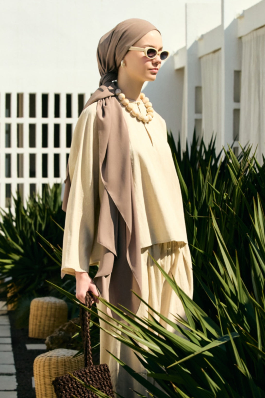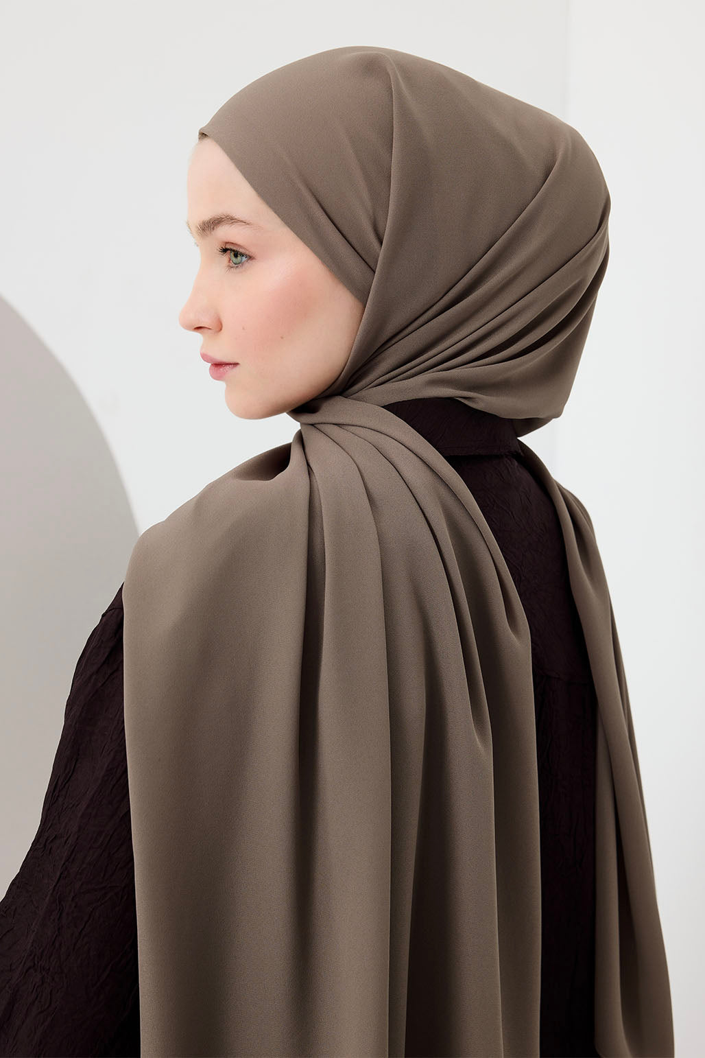 Comfort Luxe Beige Shawl is a special piece that combines practical use with an elegant look. With its built-in inner cap, it offers a ready-to-wear look in one step—no need for a separate undercap—and stays securely in place all day without slipping. Thanks to its lightweight yet structured crepe fabric, it holds its shape easily and maintains its form throughout the day.