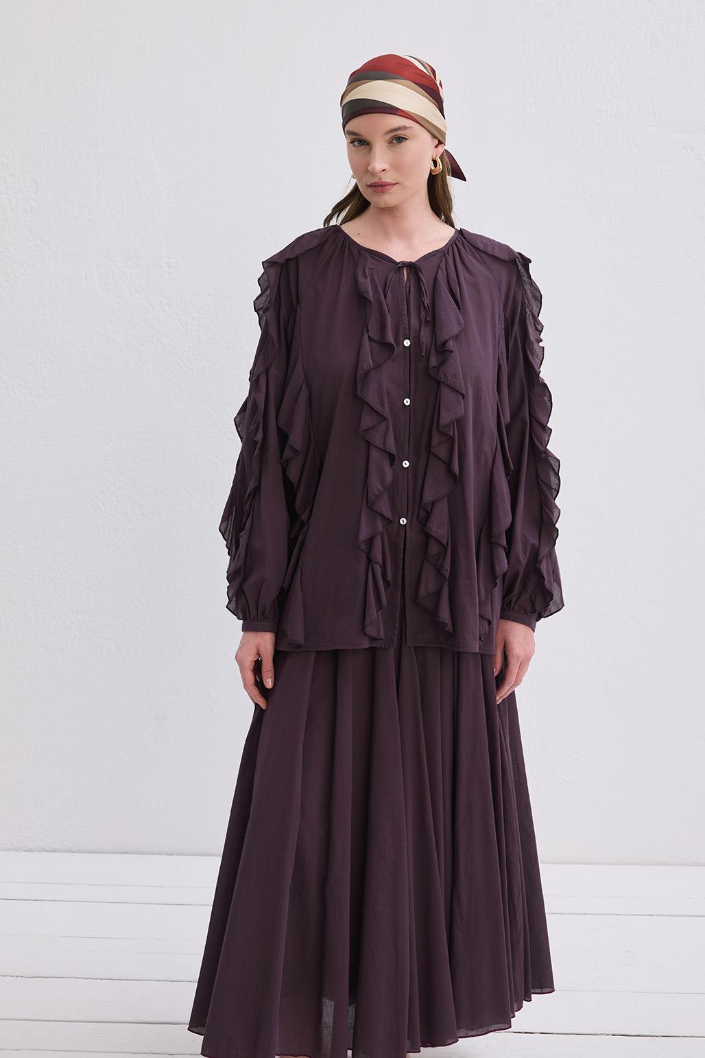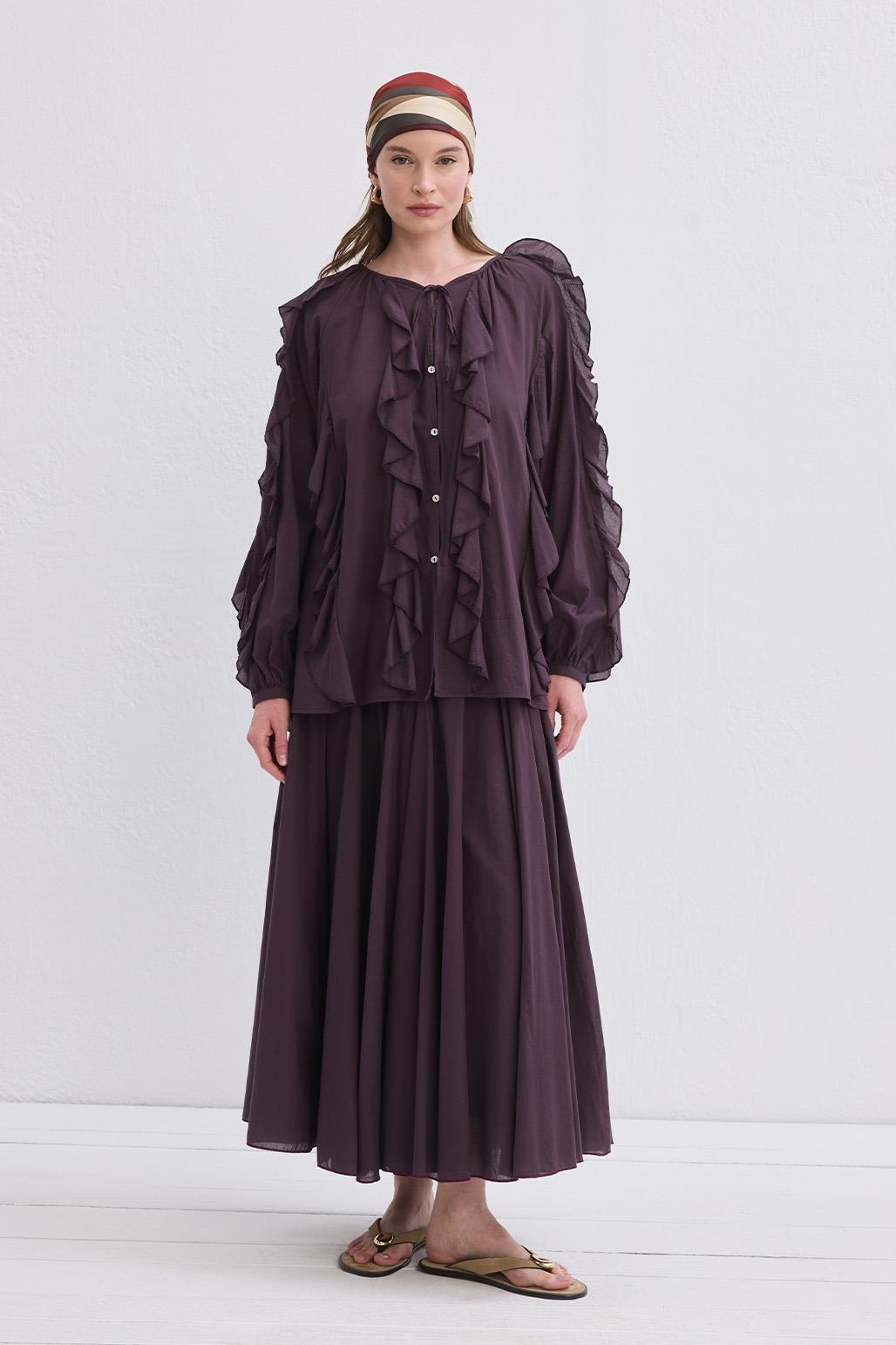 The Rosa Frilled Voile Shirt in Plum adds movement and elegance to your wardrobe with its refined cotton voile fabric and frill details. The frills along the body and sleeves elevate this chic shirt, turning it from ordinary to extraordinary. Featuring a button closure and a tie-neck detail, it blends both classic and modern styles while offering all-day comfort with its relaxed fit. Easily paired with skirts or trousers, this versatile piece can be styled for a formal evening look with high heels or for a more casual vibe with sneakers. Perfect for those who appreciate delicate details and timeless style.