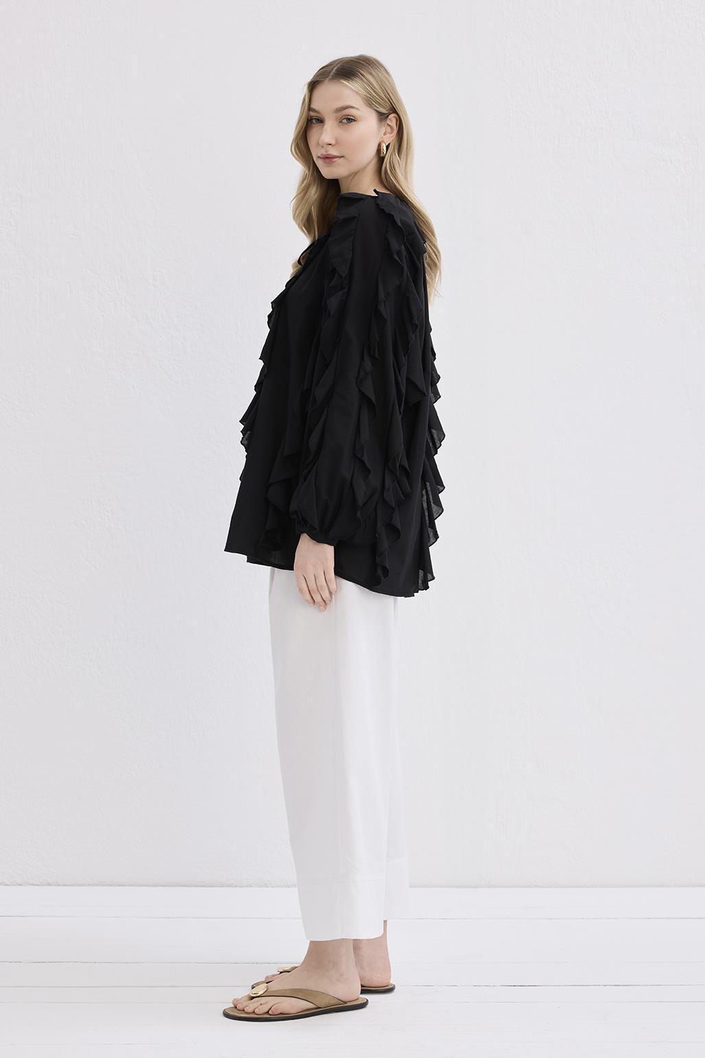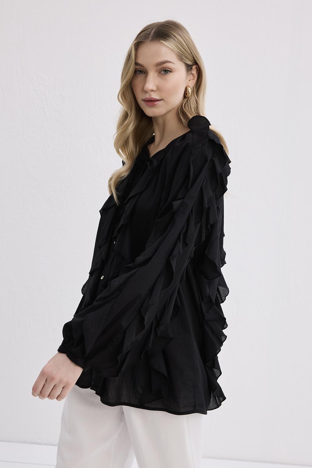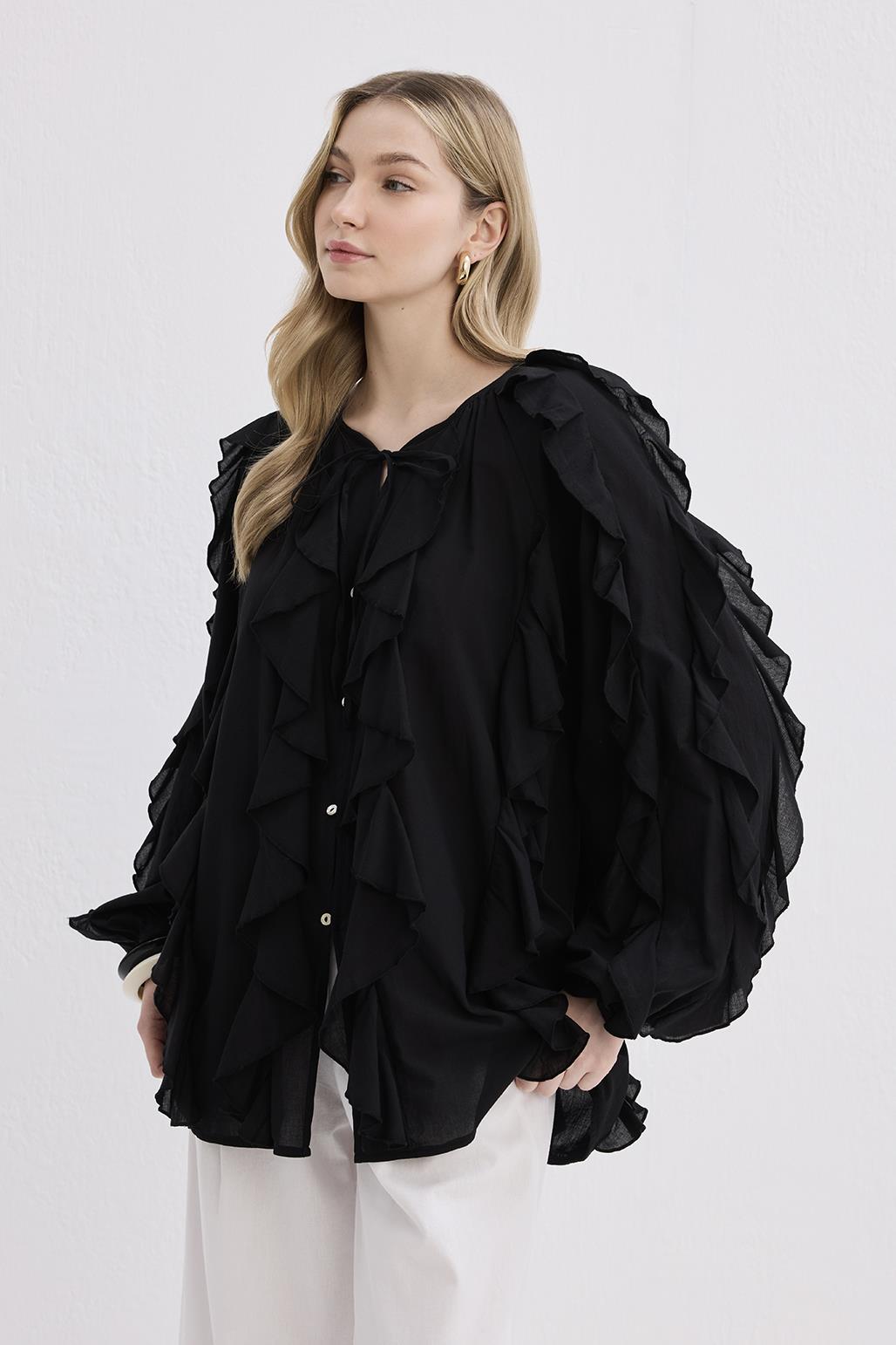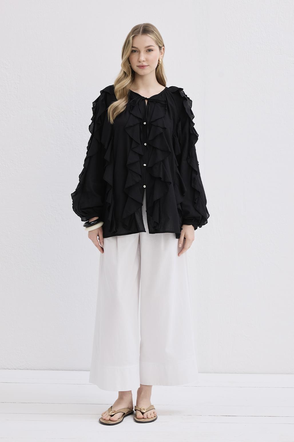 The Rosa Frilled Voile Shirt in Black adds movement and elegance to your wardrobe with its refined cotton voile fabric and frill details. The frills along the body and sleeves elevate this chic shirt, turning it from ordinary to extraordinary. Featuring a button closure and a tie-neck detail, it blends both classic and modern styles while offering all-day comfort with its relaxed fit. Easily paired with skirts or trousers, this versatile piece can be styled for a formal evening look with high heels or for a more casual vibe with sneakers. Perfect for those who appreciate delicate details and timeless style.