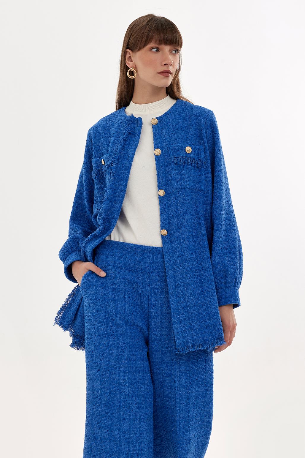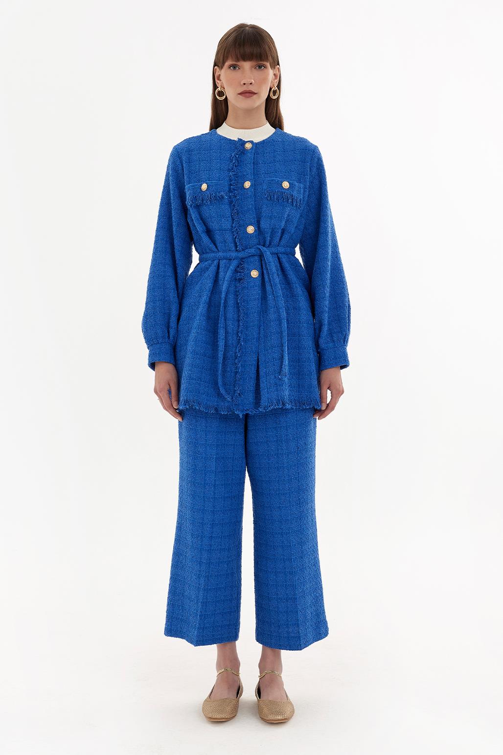 A refined ensemble that exudes sophistication. The crew neck design adds a classic touch, while the bracelet cuff details provide an elegant finish. The fringed trim detailing adds a touch of character. The jacket, complete with pockets and a detachable belt, offers a blend of functionality and style. Crafted from tweed fabric, this set is a testament to timeless elegance.