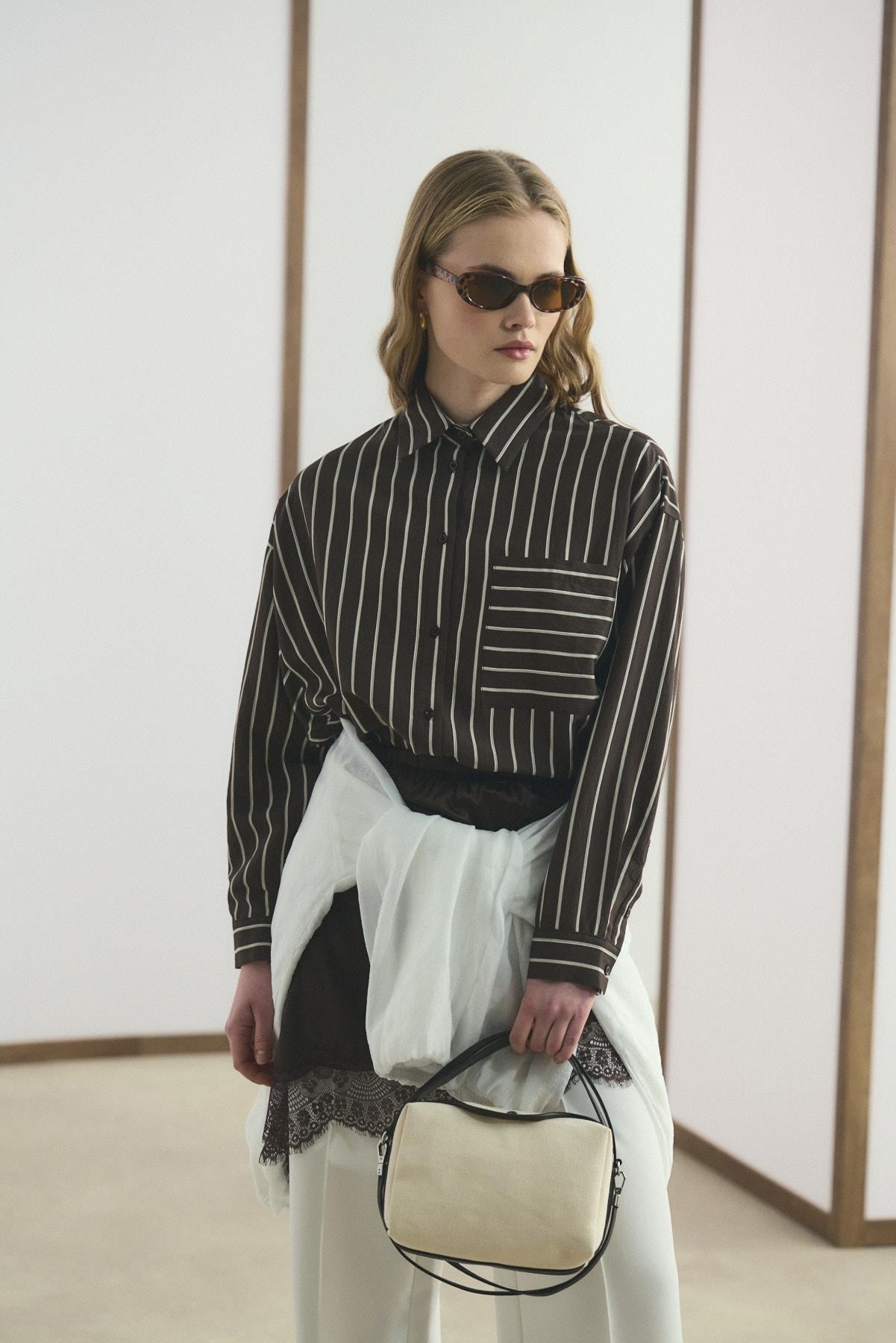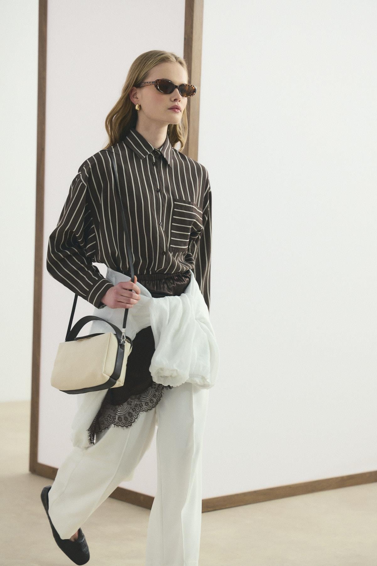 The Lace-Trim Skirt is crafted from smooth and fluid satin fabric, offering comfortable wear throughout the day. The elastic waistband allows for easy dressing and a flexible fit that adapts to the body. Its asymmetric silhouette creates a modern look, while the lace trim at the hem adds an elegant and feminine touch to the design.