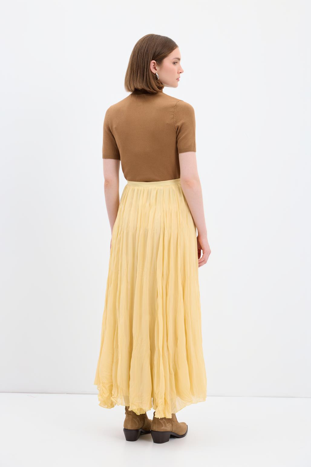 The Crinkle Effect Long Flared Skirt features textured chiffon fabric with a crinkled appearance, offering a lightweight and flowing silhouette. Its high-waist cut and panelled flared design elegantly define the shape, while the inner lining ensures comfortable wear. The side hidden zipper closure provides a clean finish. Suitable for both everyday wear and more polished outfits, this skirt is a versatile wardrobe staple.