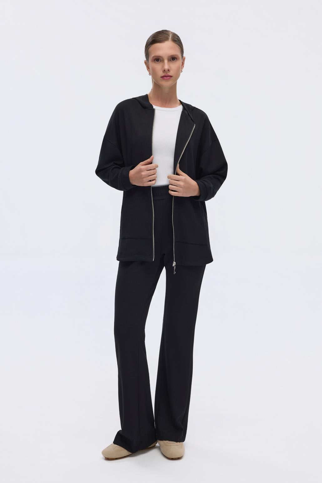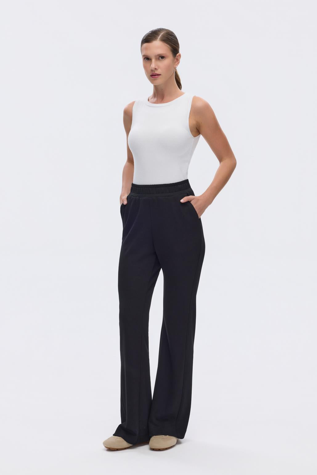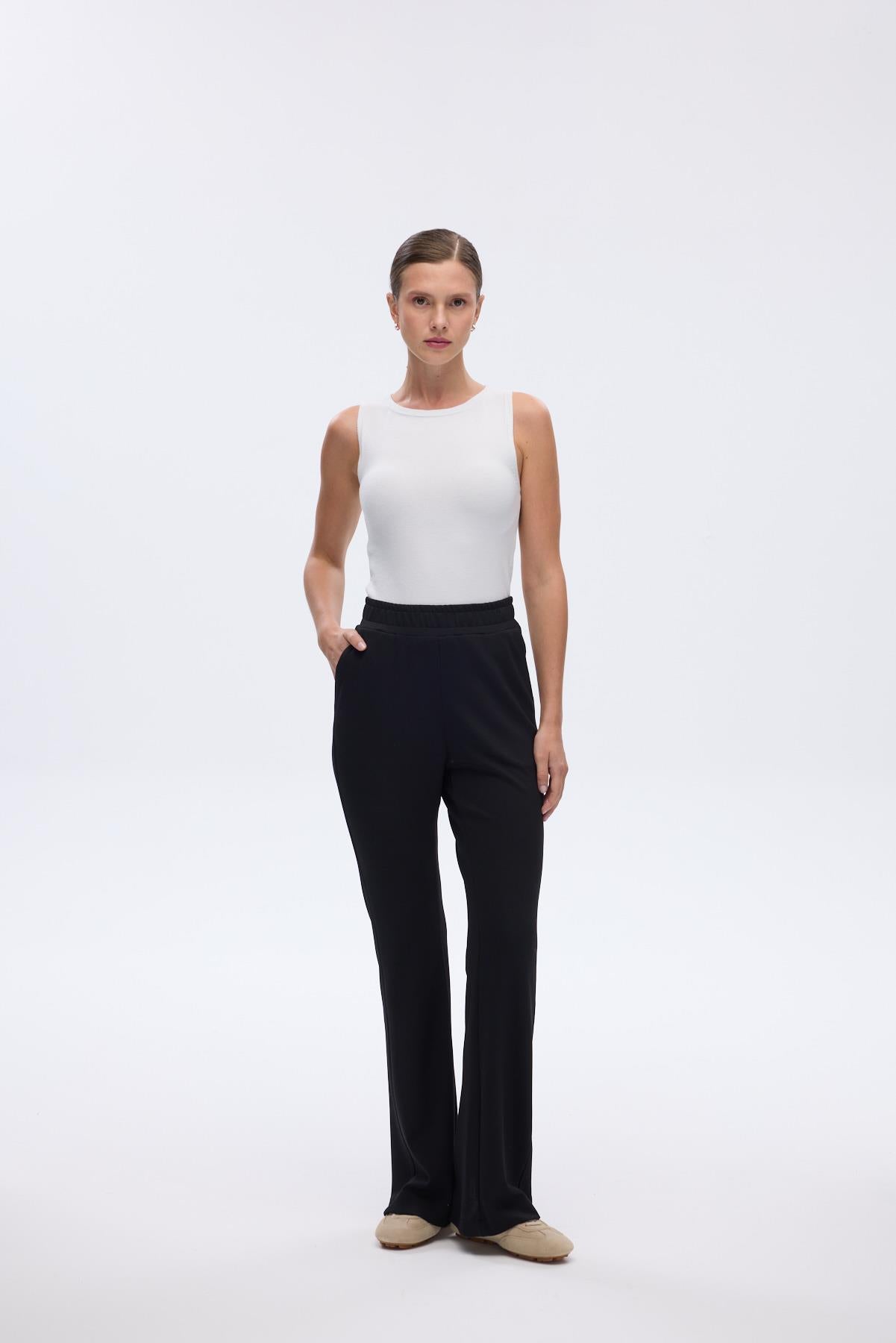 The Modal Knit Pleated Flare Pants offer all-day comfort with their high-waisted design and soft-textured modal fabric. The stitched details and wide-leg cut combine elegance and freedom of movement. The pocket design adds convenience, while the full elastic waistband gently hugs the body, providing a flattering fit. The ribbed texture gives the pants a modern touch, and when paired with basic t-shirts and sweatshirts, you can create both casual and stylish looks.