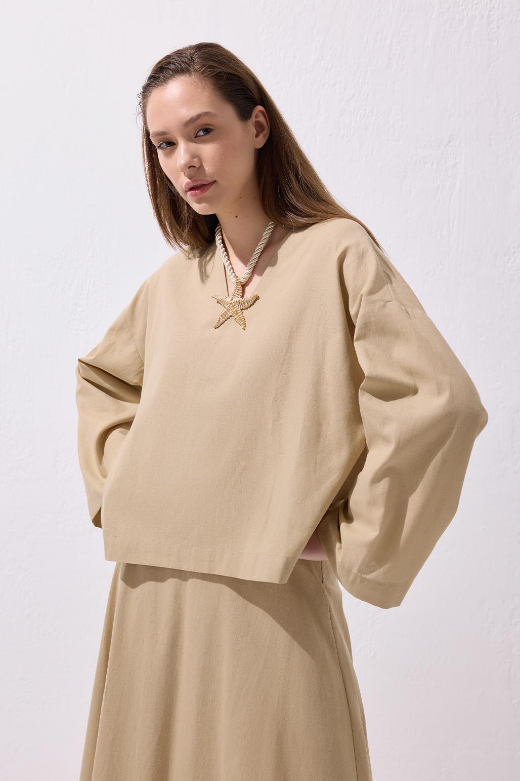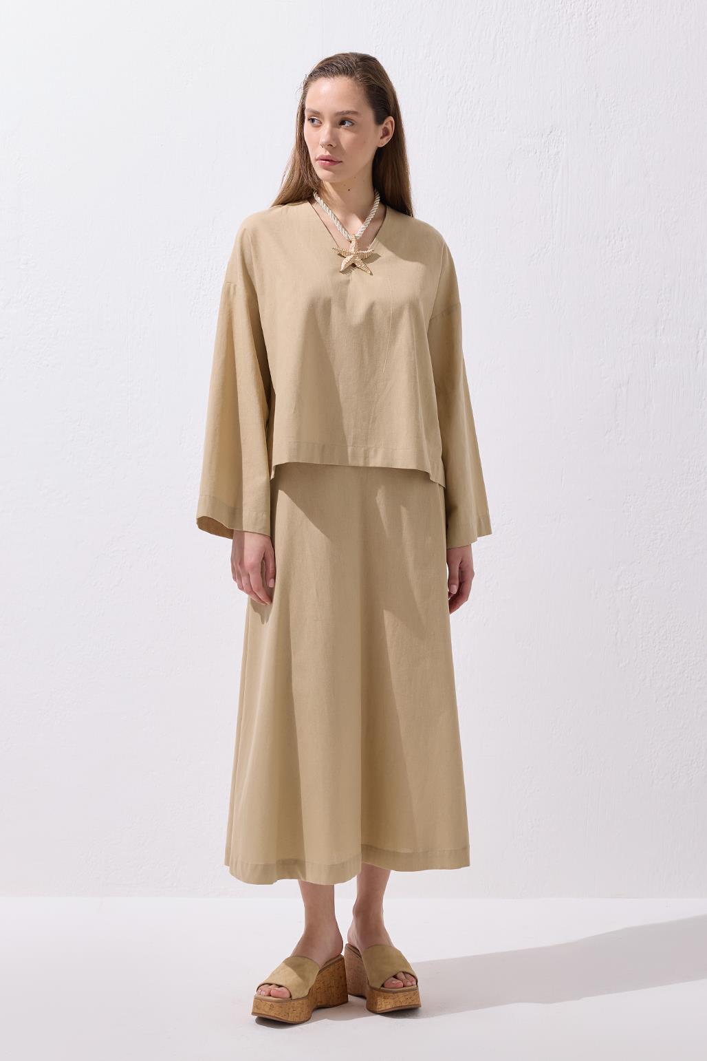 Lune Linen Shirt and Skirt Set Camel