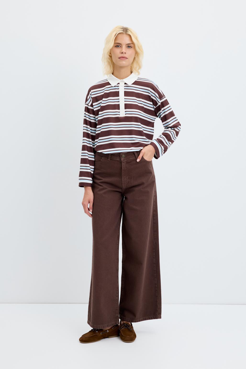 The Polo Collar Striped Sweatshirt provides all-day comfort with its cotton-blend knit fabric. The poplin collar detail adds a classic shirt-like touch to the design. The hidden button placket offers a clean and minimal look, while the side slits ensure ease of movement. Featuring cuffed sleeves and a straight cut, this piece adds effortless elegance to your everyday style.