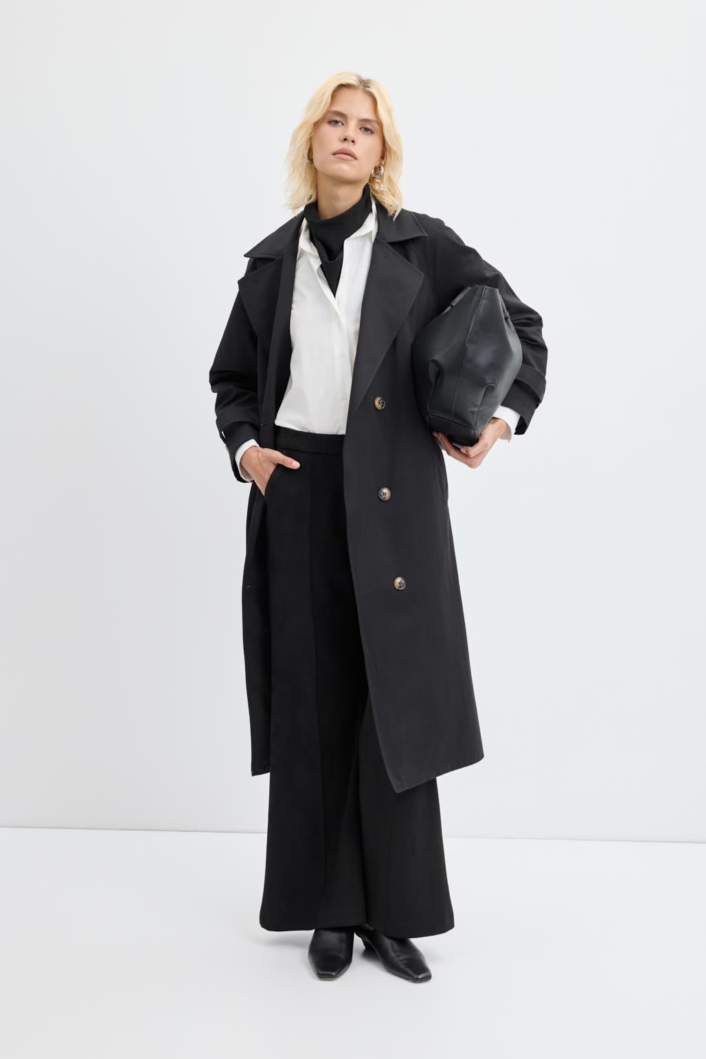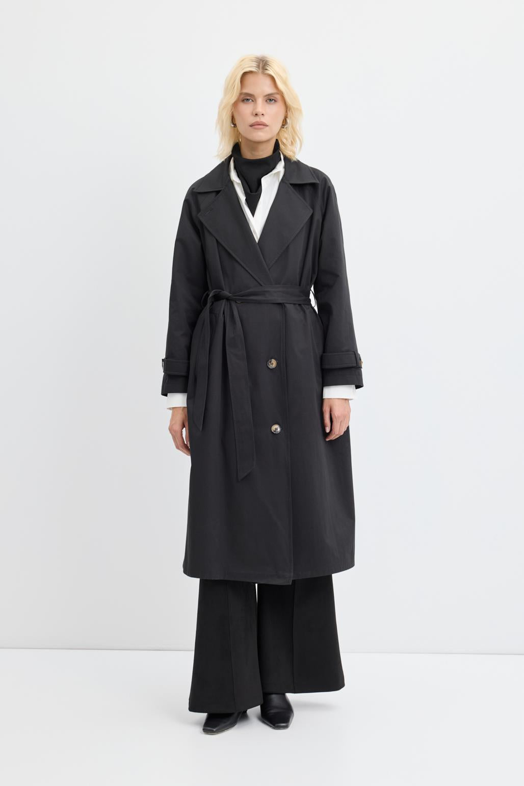 Double Bust Lined Long Trench Coat Black