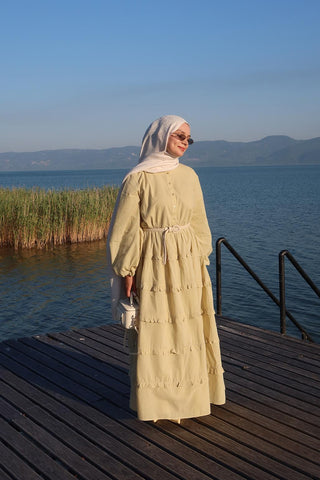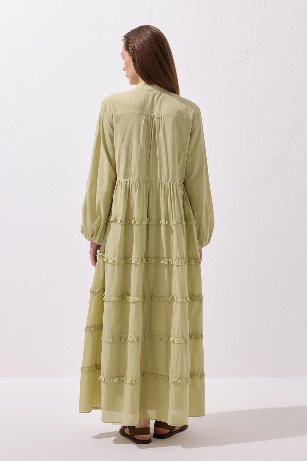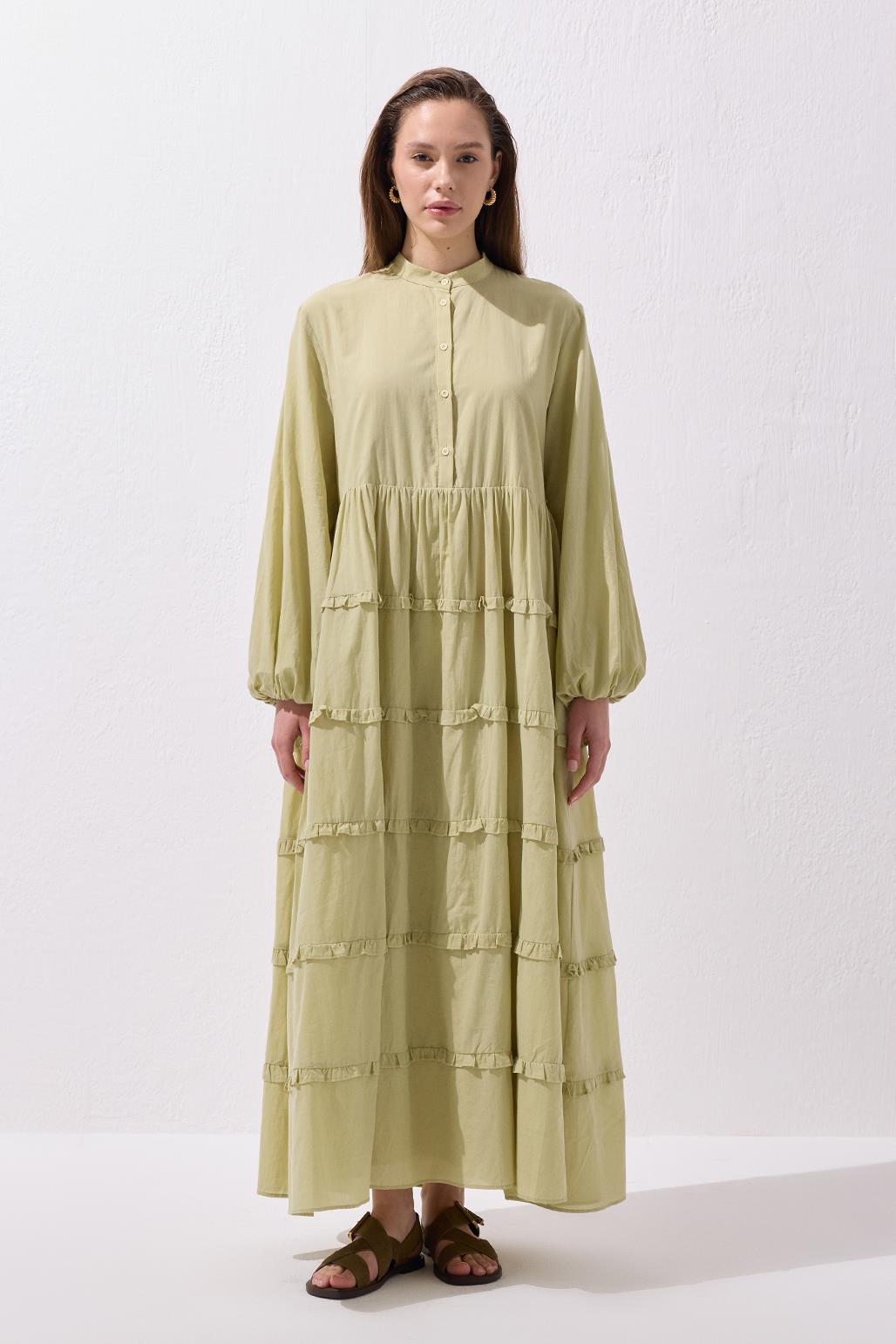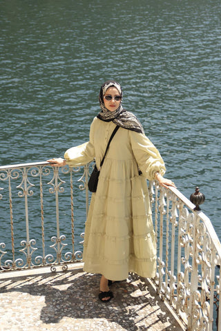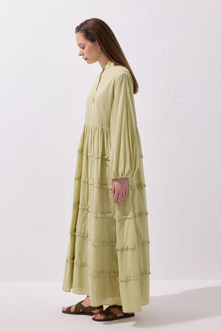 The Azur Layered Voile Maxi Dress in Sage Green offers comfort throughout the summer, thanks to its lightweight and breathable cotton voile fabric. The delicate fabric gently drapes the body while allowing freedom of movement. The half-button closure and stand-up collar add an elegant touch to the dress, while the tiered design and ruffle details create a modern, feminine silhouette. The balloon sleeves with hidden elastic cuffs combine both style and comfort, making it perfect for all-day wear. This versatile dress can be easily styled for summer evenings or special occasions, making it a favorite piece in your wardrobe.