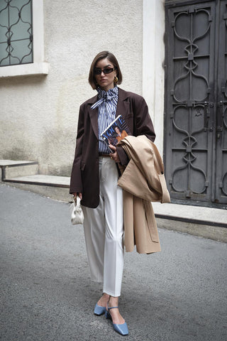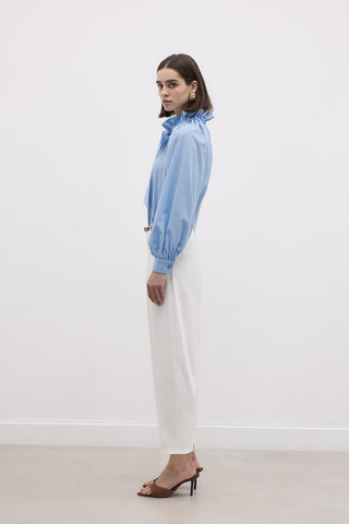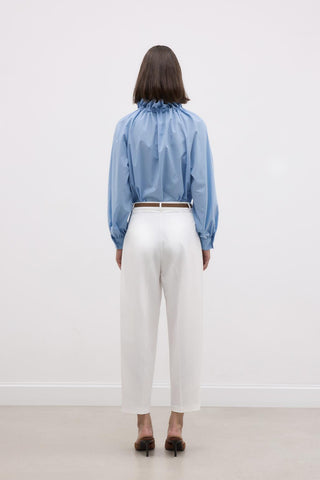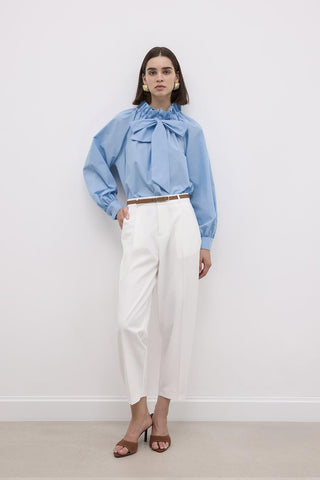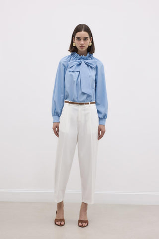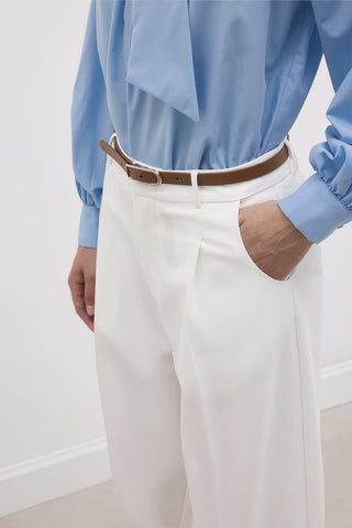 High waist, two front pleats, iron-on marks, side pockets, front zipper closure,