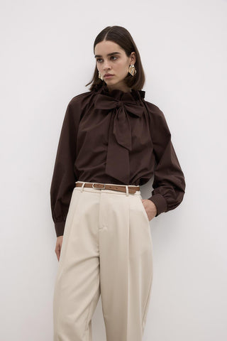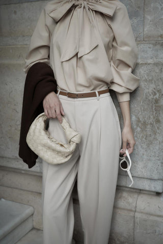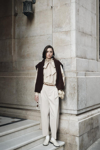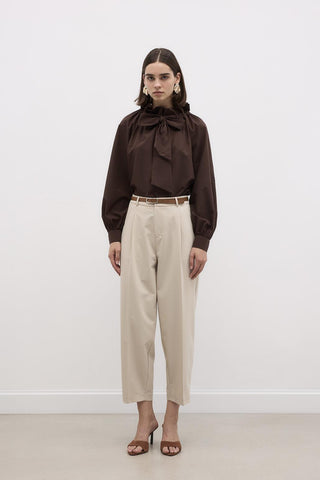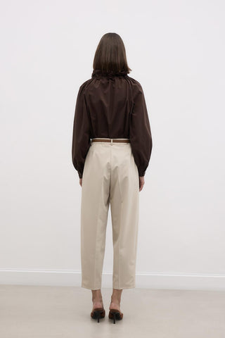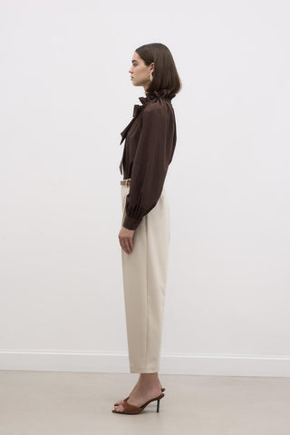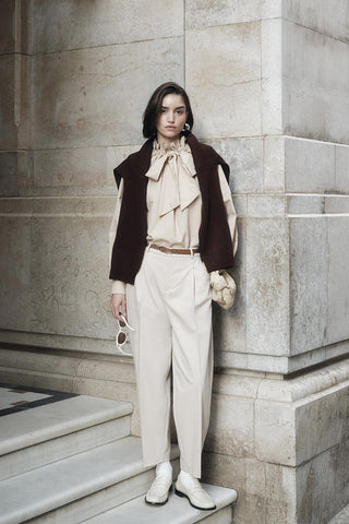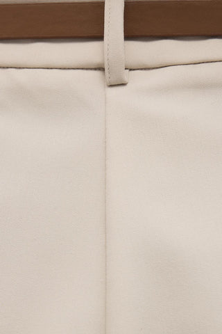 High waist, two front pleats, iron-on marks, side pockets, front zipper closure,