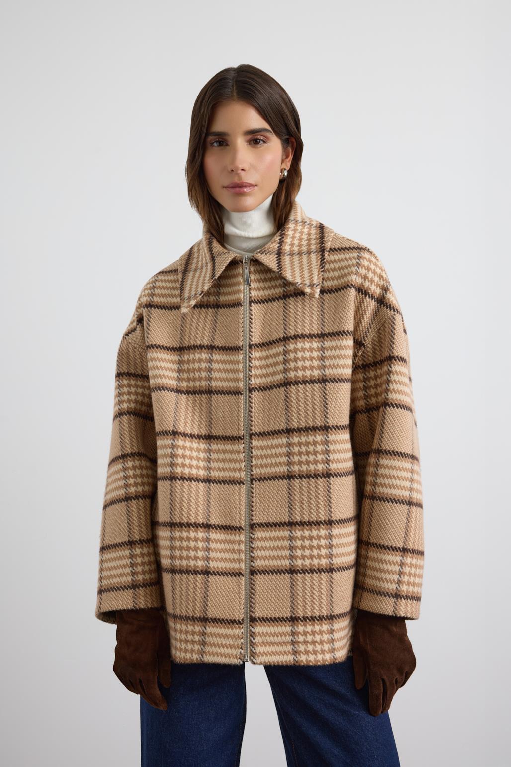 The Checked Bomber Jacket with Fur Collar is crafted from soft viscose blend coat fabric. Its detachable mélange faux fur collar adds warmth and a stylish touch, while the front zipper closure ensures ease of wear. The knitted plaid pattern brings a modern and chic look to your outfit.