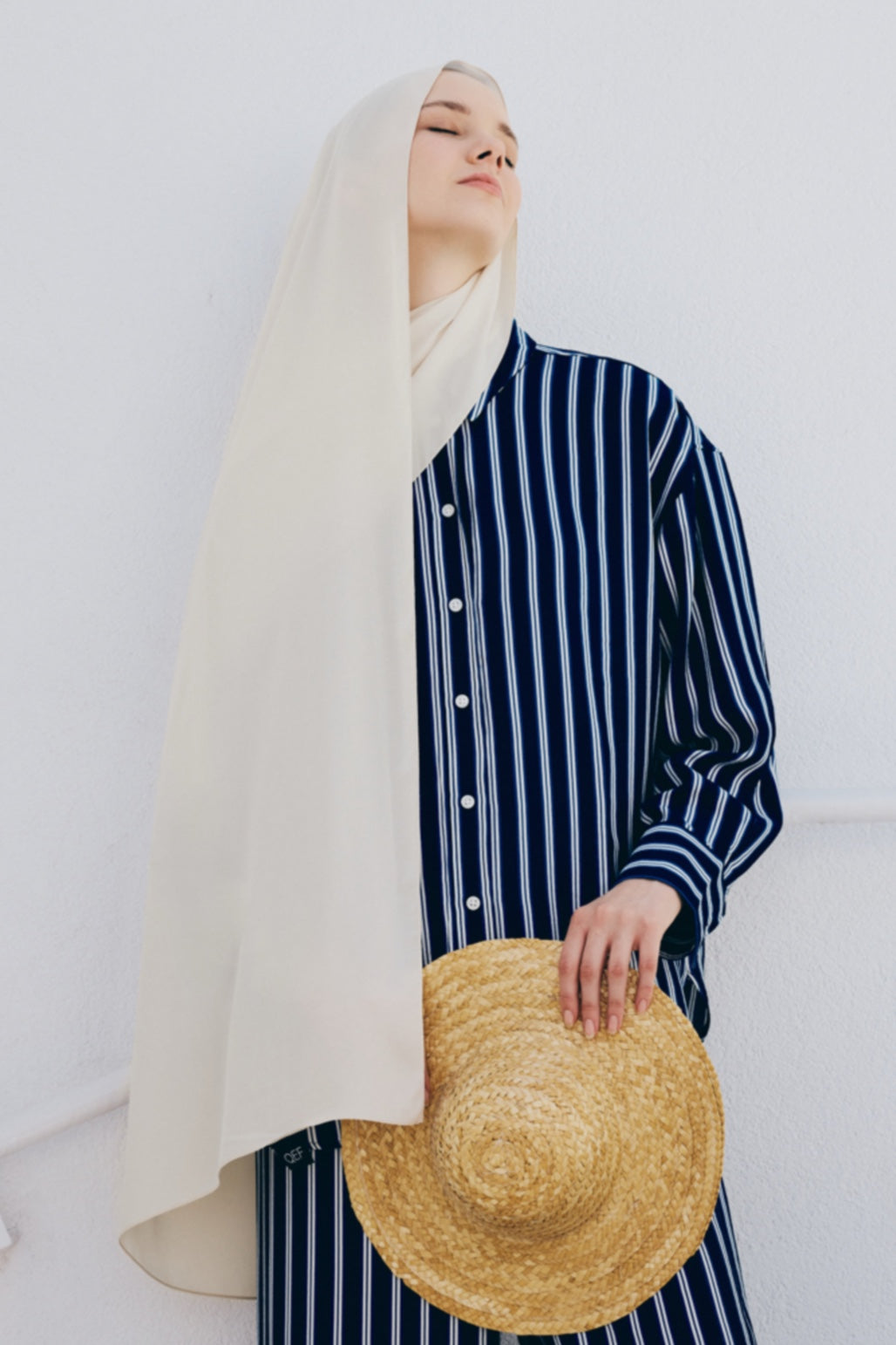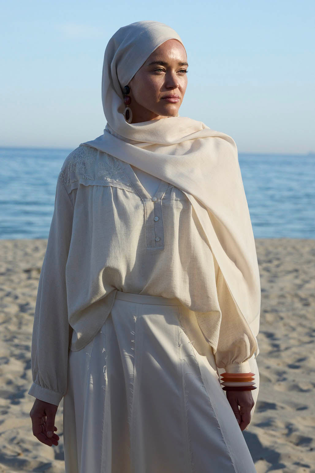 The Cotton Line Silk-Cotton Shawl Ecru is a refined blend of natural cotton fibers and delicate silk, offering an airy, lightweight feel with an effortlessly elegant look. This special piece stands out with its soft texture and subtle structure, making it a timeless addition to any modest wardrobe.