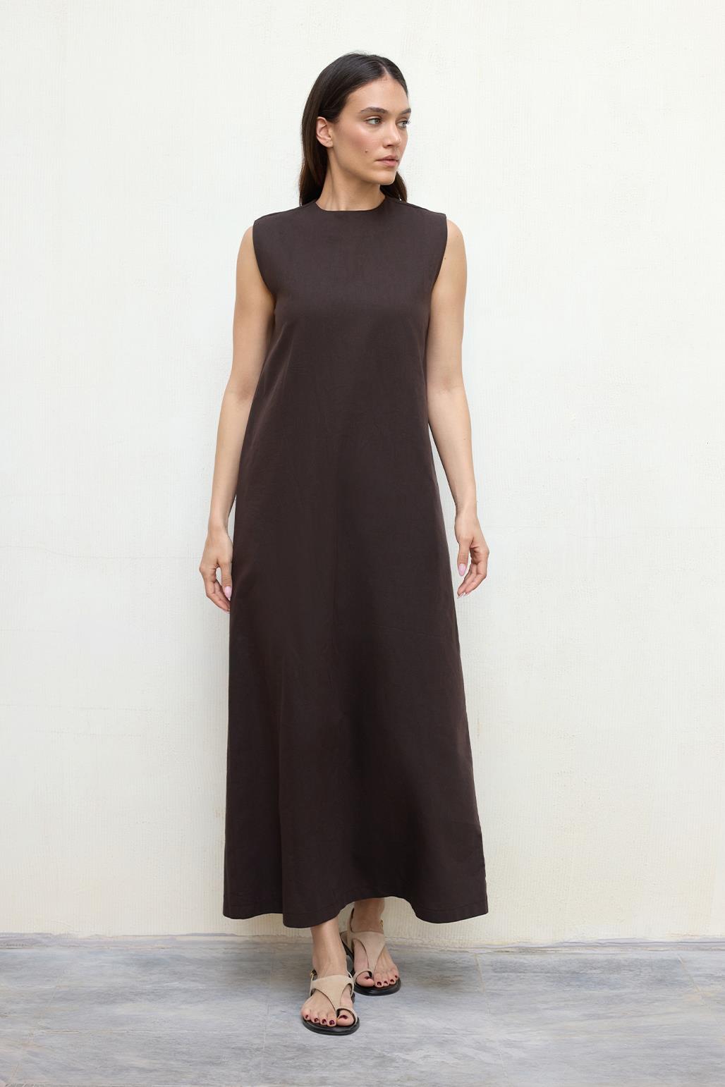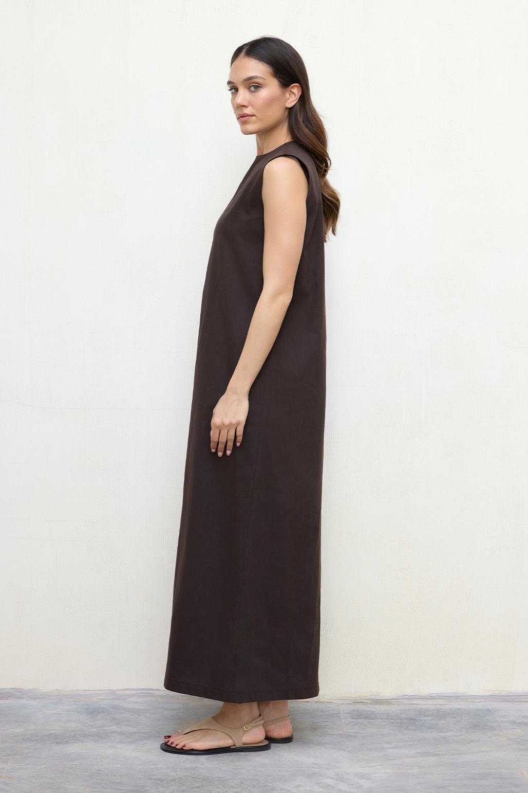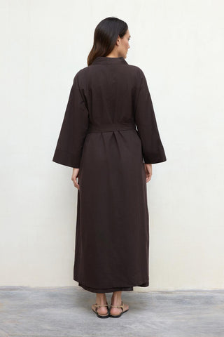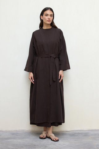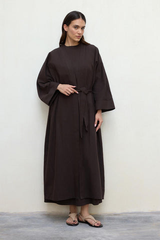 The Dena Two-Piece Abaya Set Brown is crafted from a breathable linen-viscose blend, offering comfort and lightness on warm days. The inner layer features a sleeveless, straight-cut dress that provides a clean and simple base, while the outer layer is designed with a wide-fit silhouette and T-cut sleeves—striking the perfect balance between ease and elegance. The adjustable belt detail allows the piece to be shaped to your body and styled in multiple ways, making it a versatile staple for modest wardrobes.