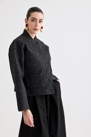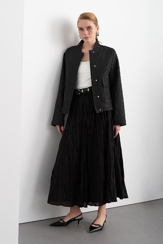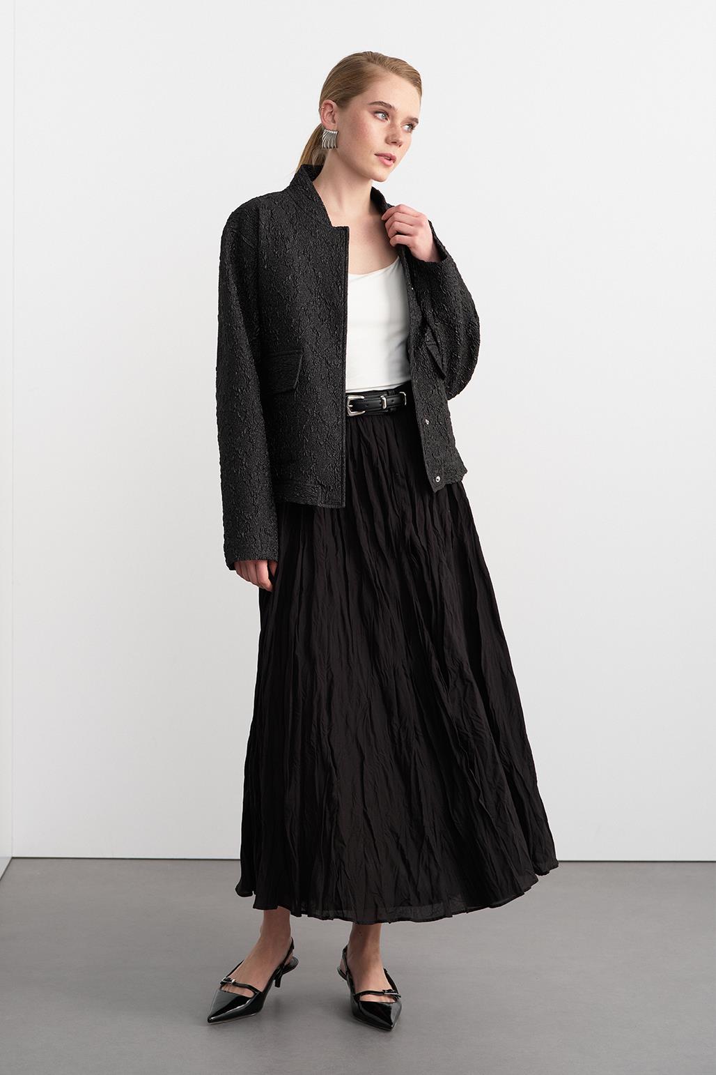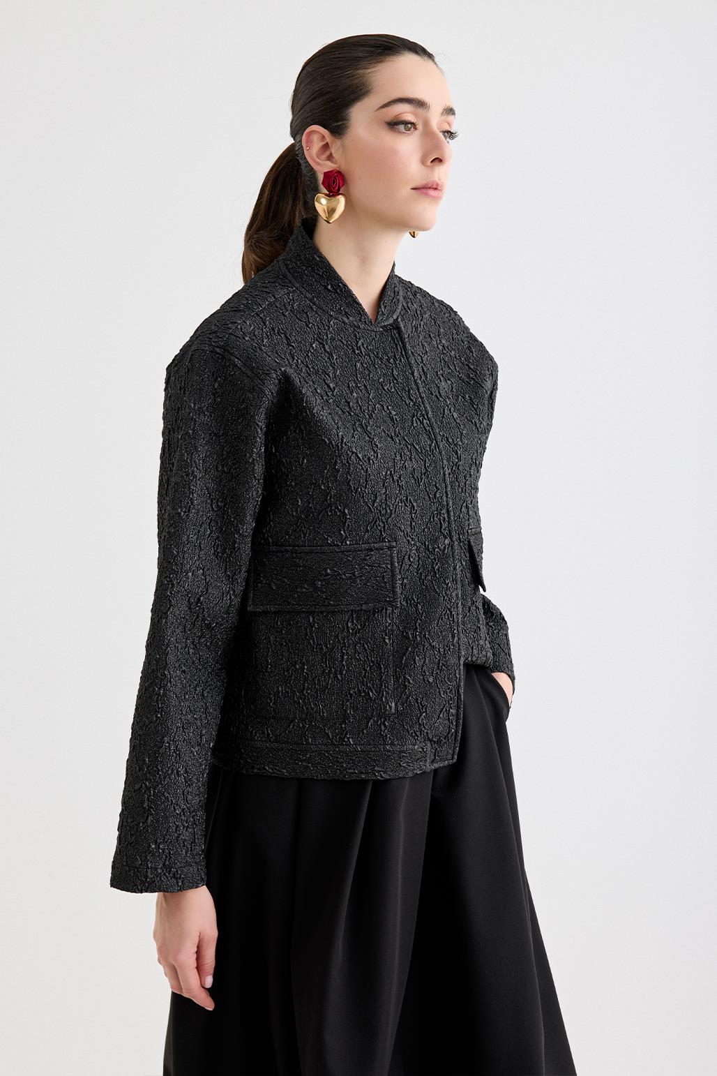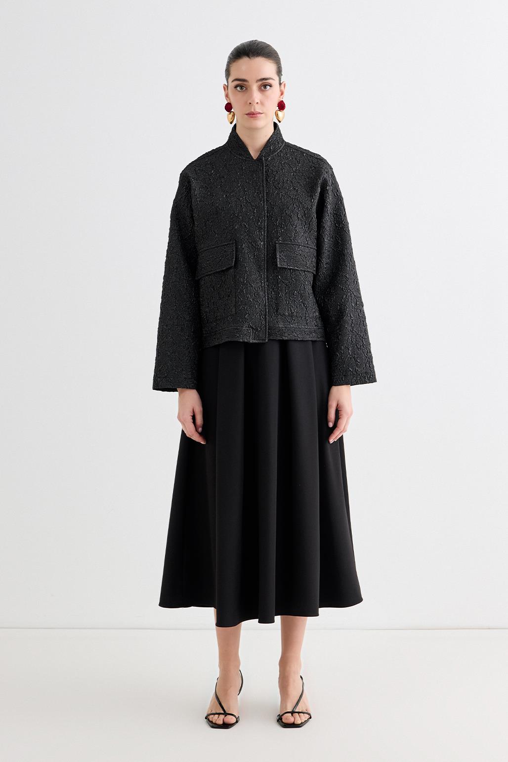 The Denia Jacquard Midi Bomber Jacket offers a timeless style suitable for both everyday wear and special occasions, thanks to its special woven metallic jacquard fabric. The stand-up collar design and flap pockets provide practicality while creating a modern and chic look. This bomber jacket, enriched with subtle details, complements a variety of pieces, from slim-fit trousers to pleated skirts, highlighting your style. Its versatile nature makes it a must-have staple in your wardrobe.
