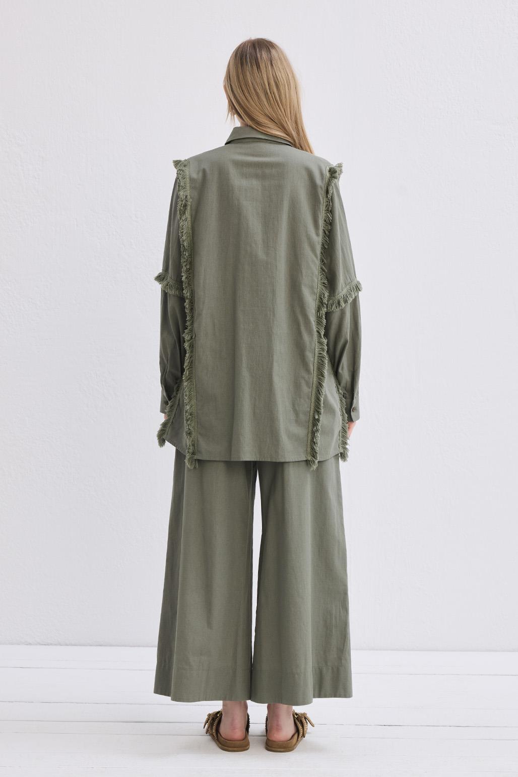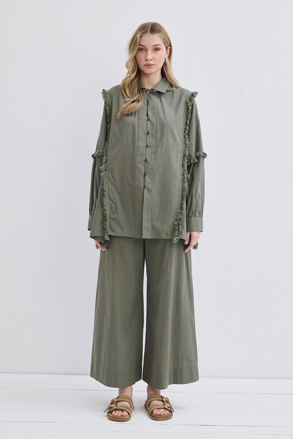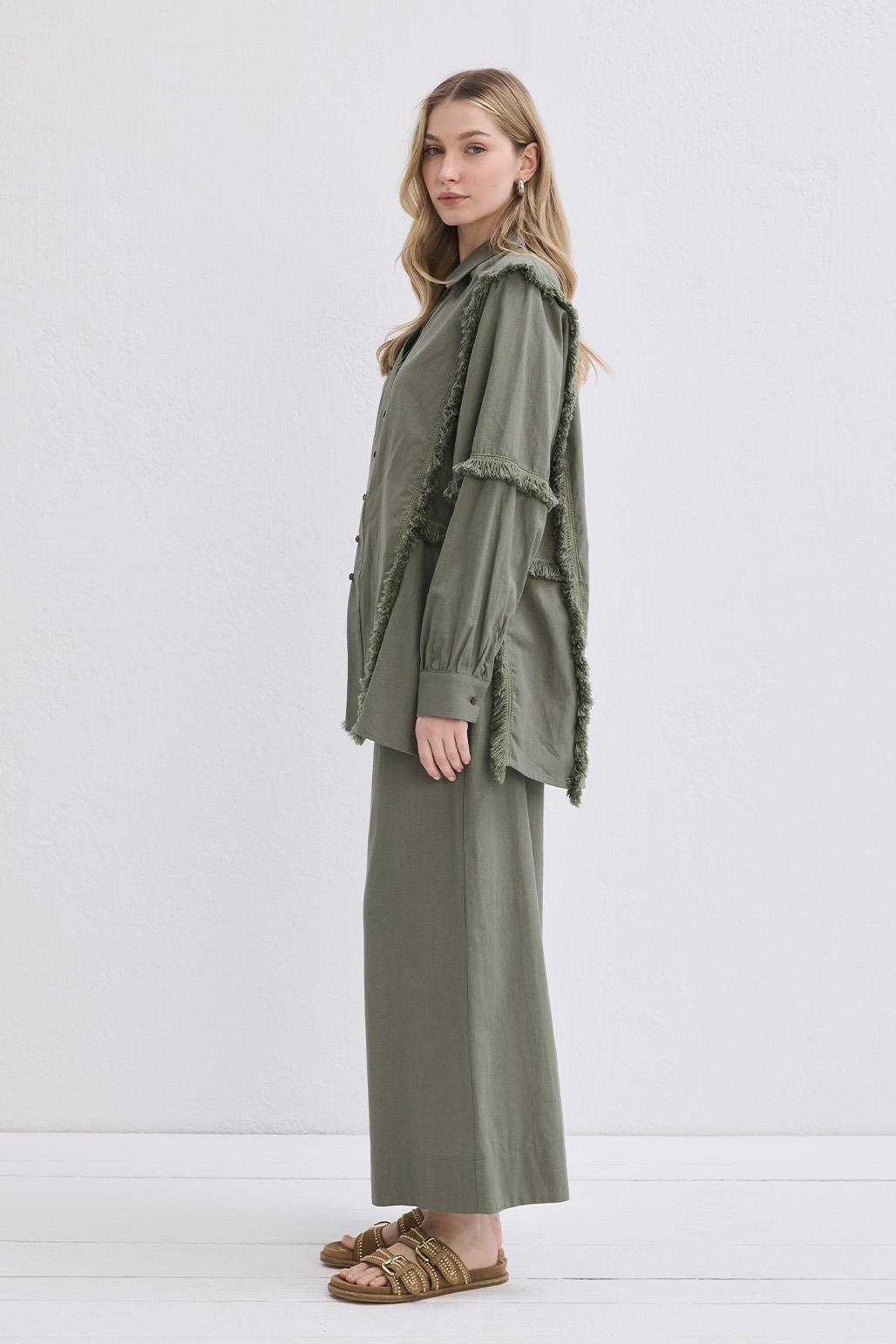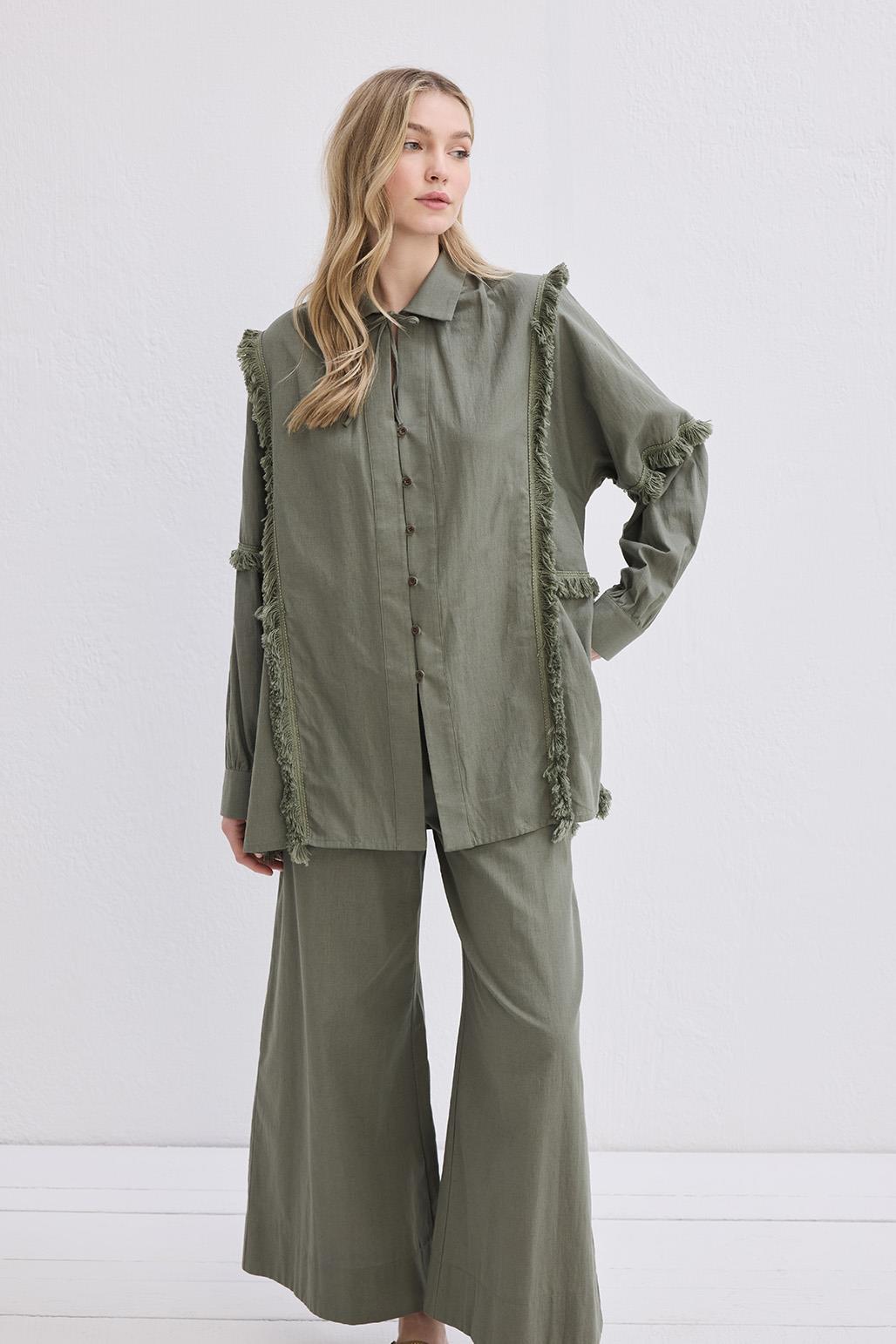 The Doria Fringed Linen Shirt in Khaki Green offers a light, breathable feel and a naturally elegant look with its viscose-blend linen fabric. The classic collar and tab button closure create a clean, minimal appearance, while the side slits and fringe details introduce a subtle bohemian touch. Accented with tone-matching accessories, the design is versatile enough for effortless daily styling or for creating unique summer evening looks. With its timeless silhouette and distinctive detailing, this shirt is a standout piece in any wardrobe.