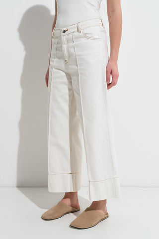 Made from cotton denim fabric, these jeans feature a high waist with a zip closure, elastic back waist, pockets, and front seam stitching. The design includes a double-cuff finish.