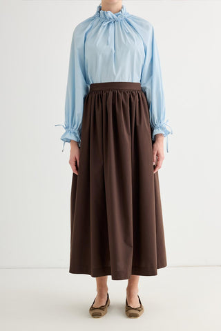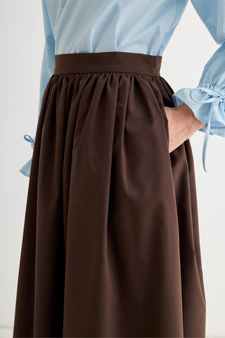 The Erla high-waisted skirt with gathered details offers a feminine silhouette in a rich brown color. The voluminous, flared shape provides freedom of movement, while the zip closure at the waist ensures ease of wear. Its lightweight fabric and elegant design make it perfect for completing daily outfits, or for pairing with a stylish blouse and heels for a more formal event. Combining both comfort and elegance, this skirt is sure to become a wardrobe staple!