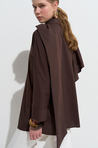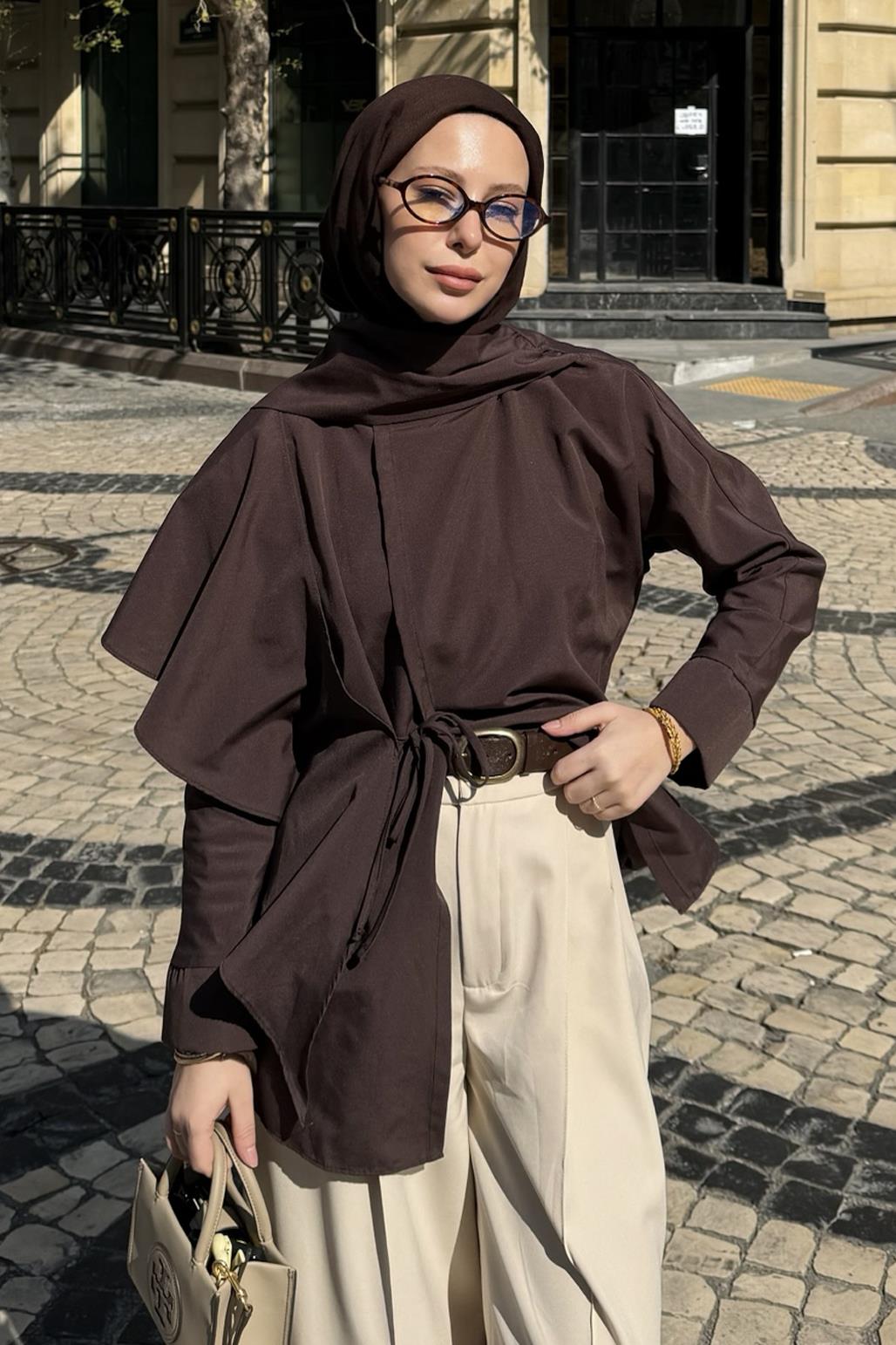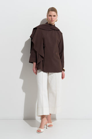 The Evan Tied Shirt, made from a cotton-blend, breathable fabric, offers both comfort and style throughout all seasons with its fluid design. Its layered and tie details create a dynamic and modern style. For everyday wear, it pairs well with textured culottes for a relaxed look, or you can create an elegant outfit with palazzo pants and refined accessories for a more sophisticated style. The shawl collar and ruffle details make this design stand out, making it a timeless and versatile addition to your wardrobe.