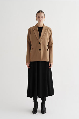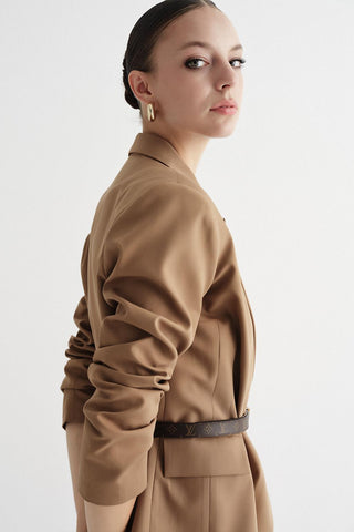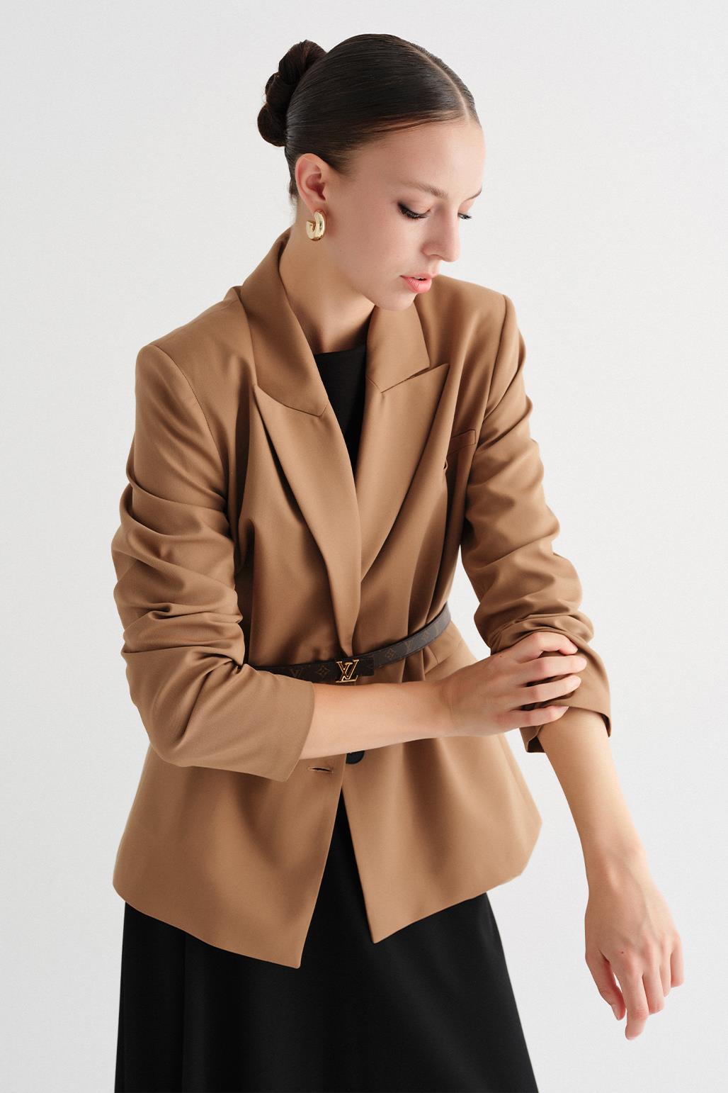 Lined, swallow collar, shoulder padded, flap pocket, dart detail,