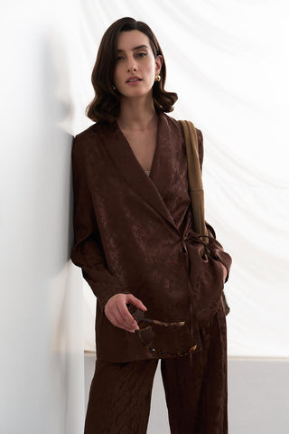Folded shawl collar, side fabric tie detail, lined, padded shoulders, straight-cut blazer