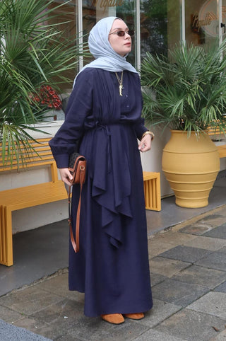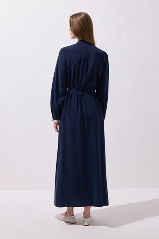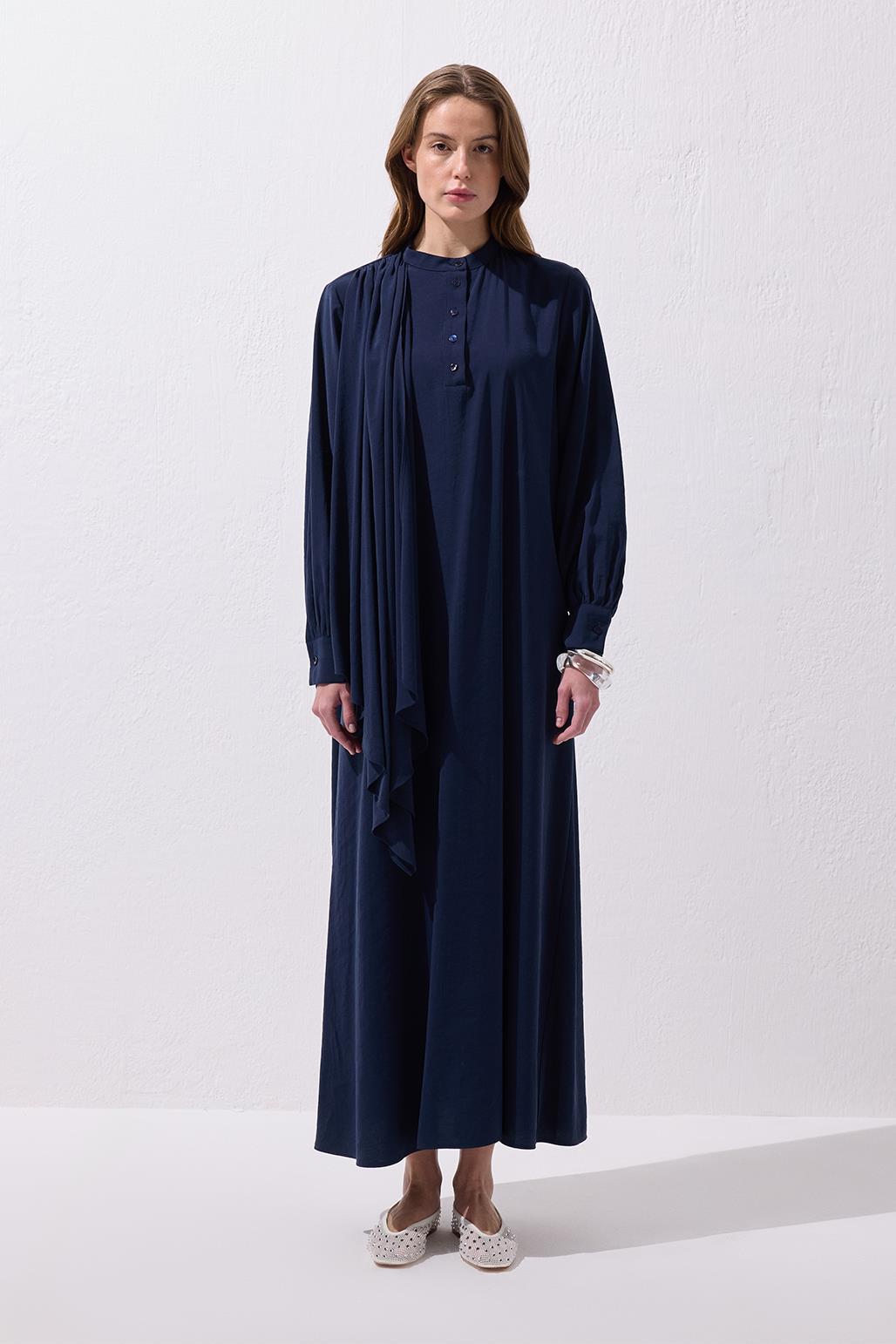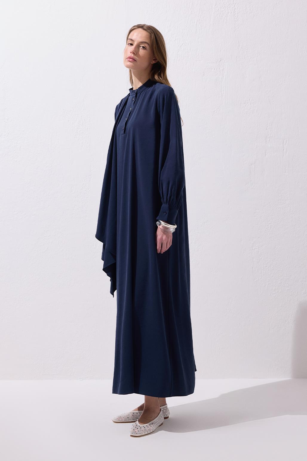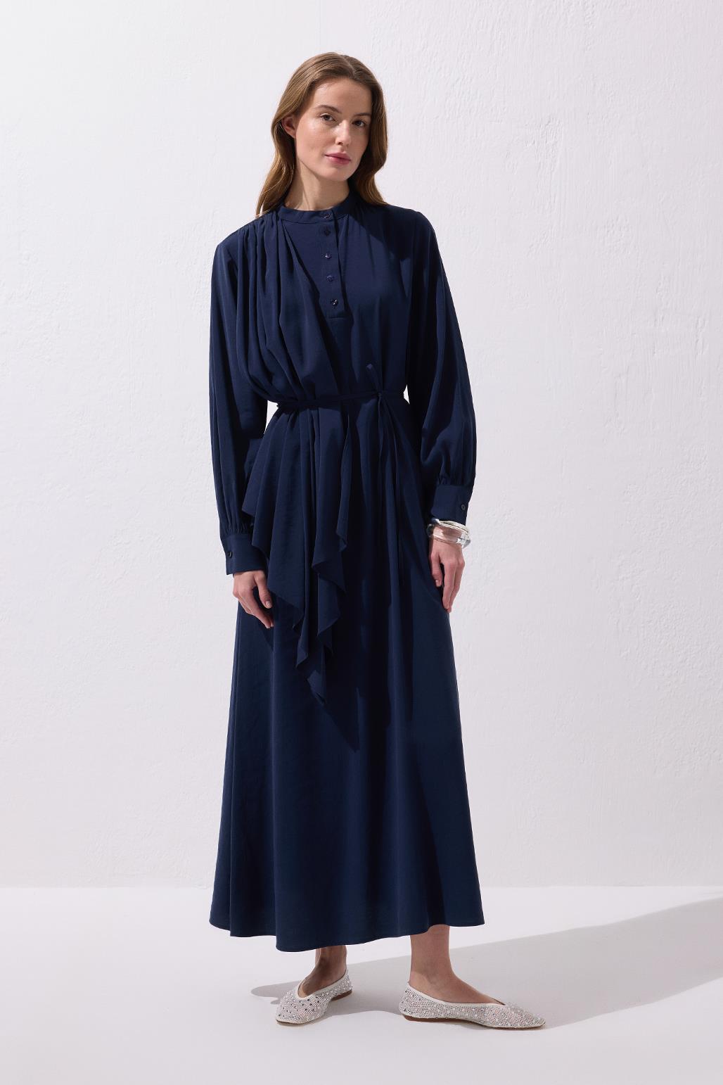 The Loi Shawl Collar Dress in Navy offers a graceful flow with its drapey modal-blend fabric and elegant shawl detail that cascades from the shoulder. Featuring a stand-up collar and a partial button-down front, it maintains a modern, clean look. The removable tie belt lets you adjust the silhouette to your style, making it versatile for different occasions. Pair it with flat sandals for a simple daytime outfit, or elevate it with heels for an elegant evening look. With its relaxed fit and unique design, this dress blends comfort and sophistication, making it a standout piece for every moment.