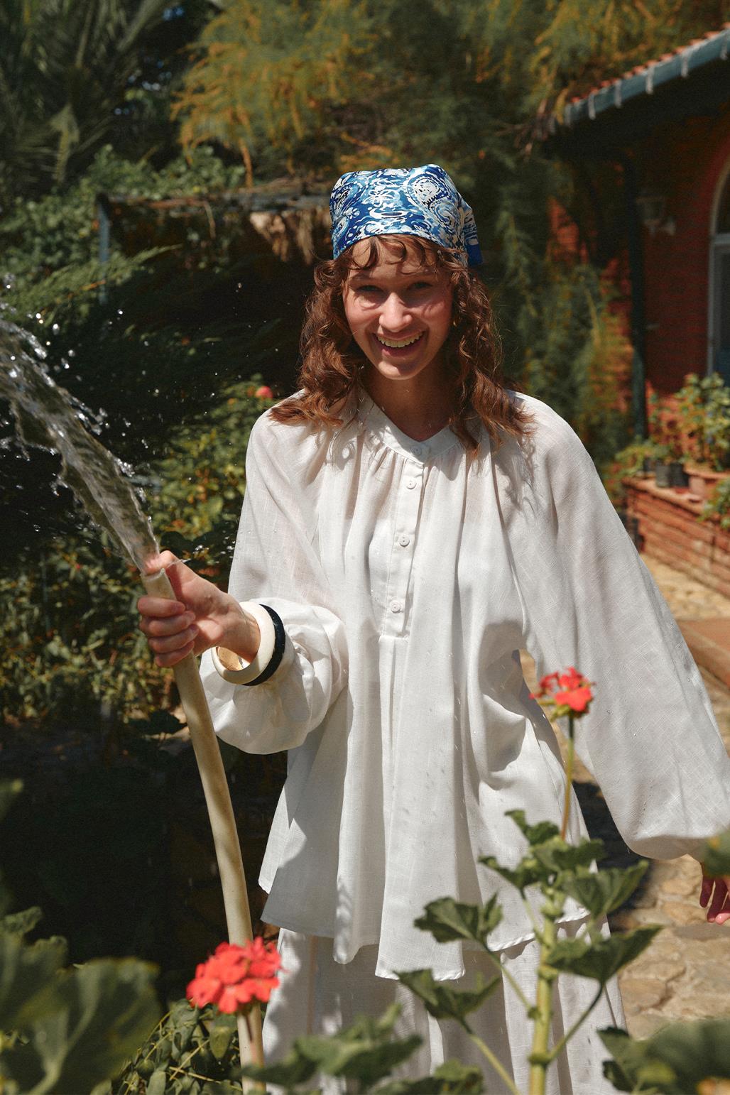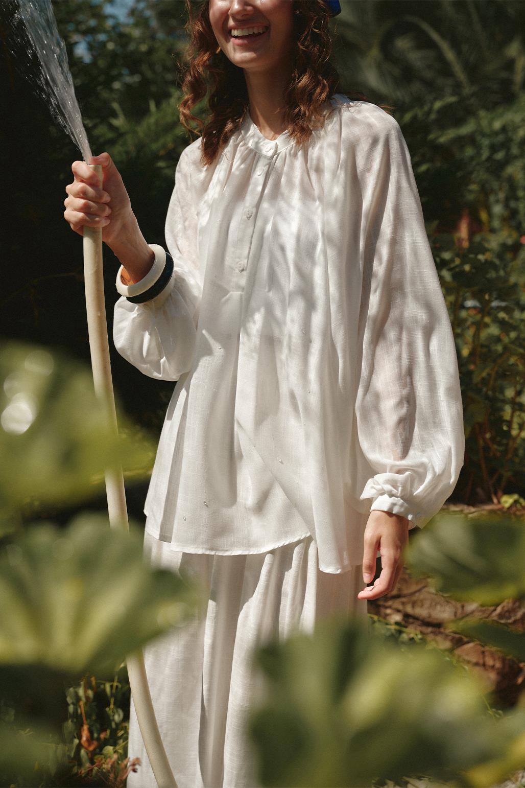 Stand-up collar, half placket, gathers at shoulders and collar,