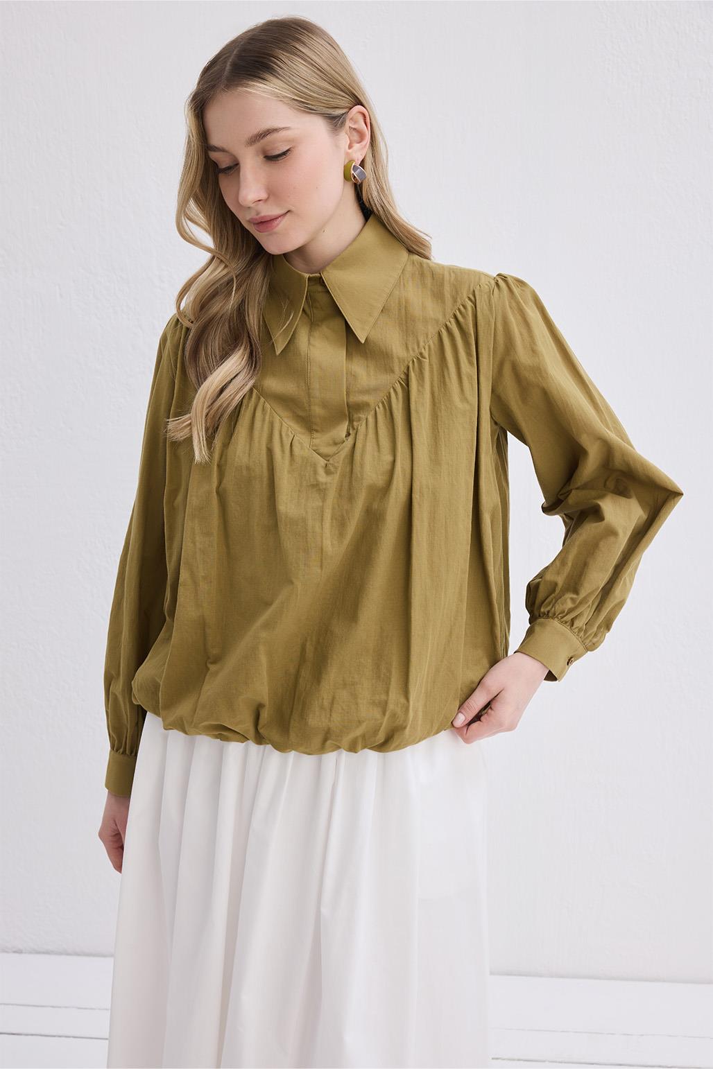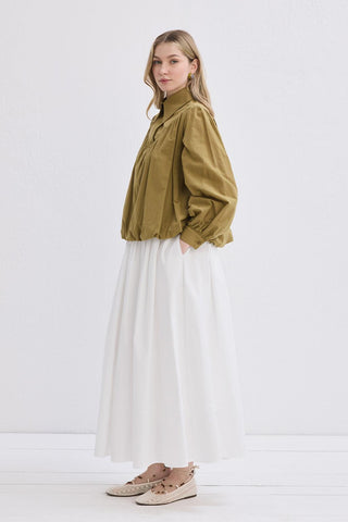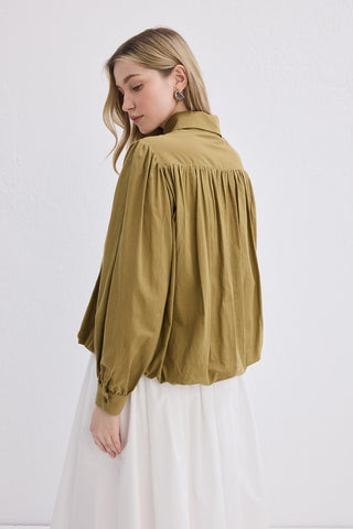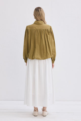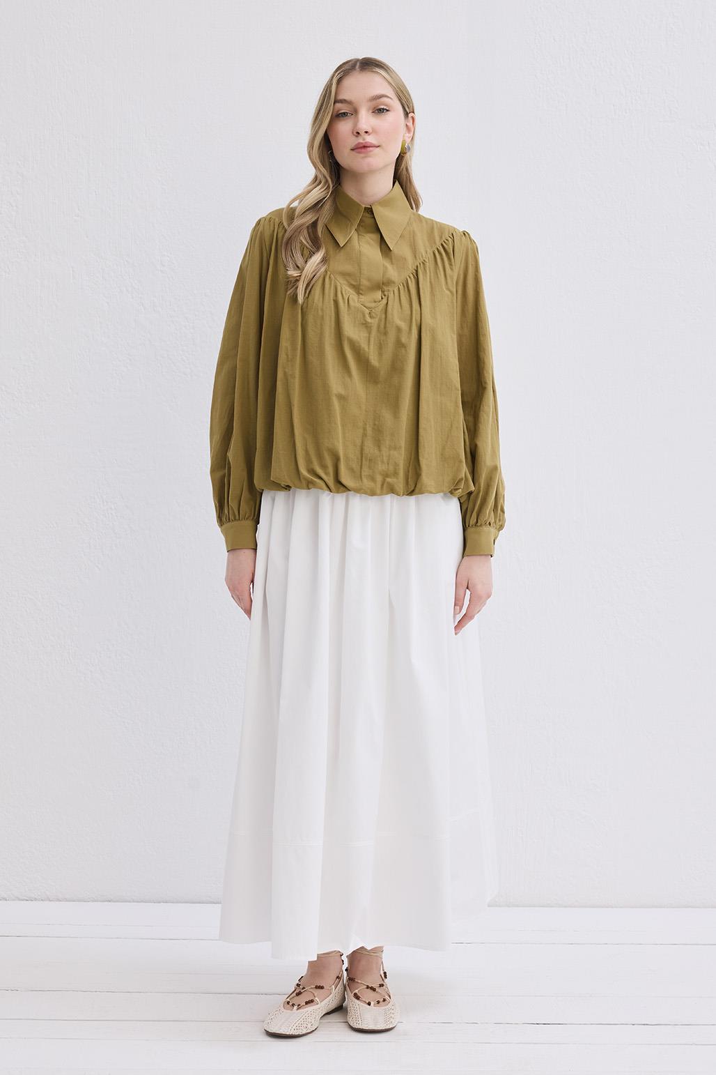 The Lora Voile Shirt in Green combines lightness and comfort with timeless design, thanks to its cotton voile fabric and classic collar. The half-placket button closure adds a subtle, structured detail, while the yoke and balloon-shaped hem create a voluminous yet balanced silhouette. Ideal for pairing with jeans for a casual look or styled with tailored trousers for a more professional outfit, this piece blends seasonless elegance with everyday ease. A standout contender for your summer wardrobe, offering both refinement and comfort.