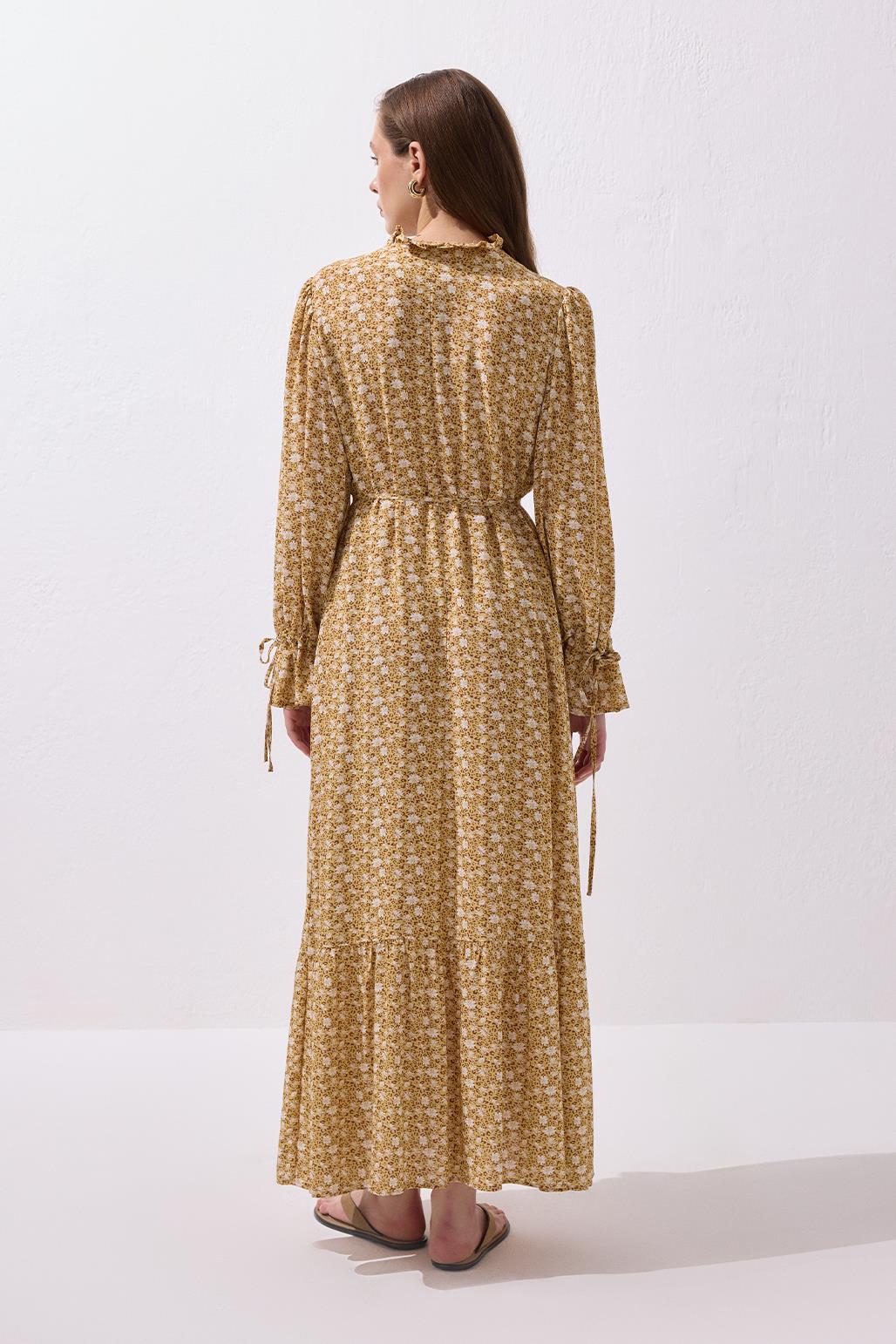 Made from viscose fabric, it features a V-neck with ruffle detail, an asymmetrical hem, and wide sleeves with adjustable drawstring cuffs. The dress has a relaxed, full-length fit.