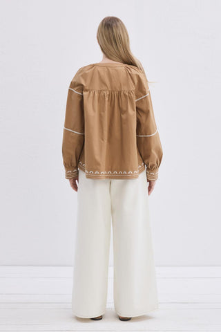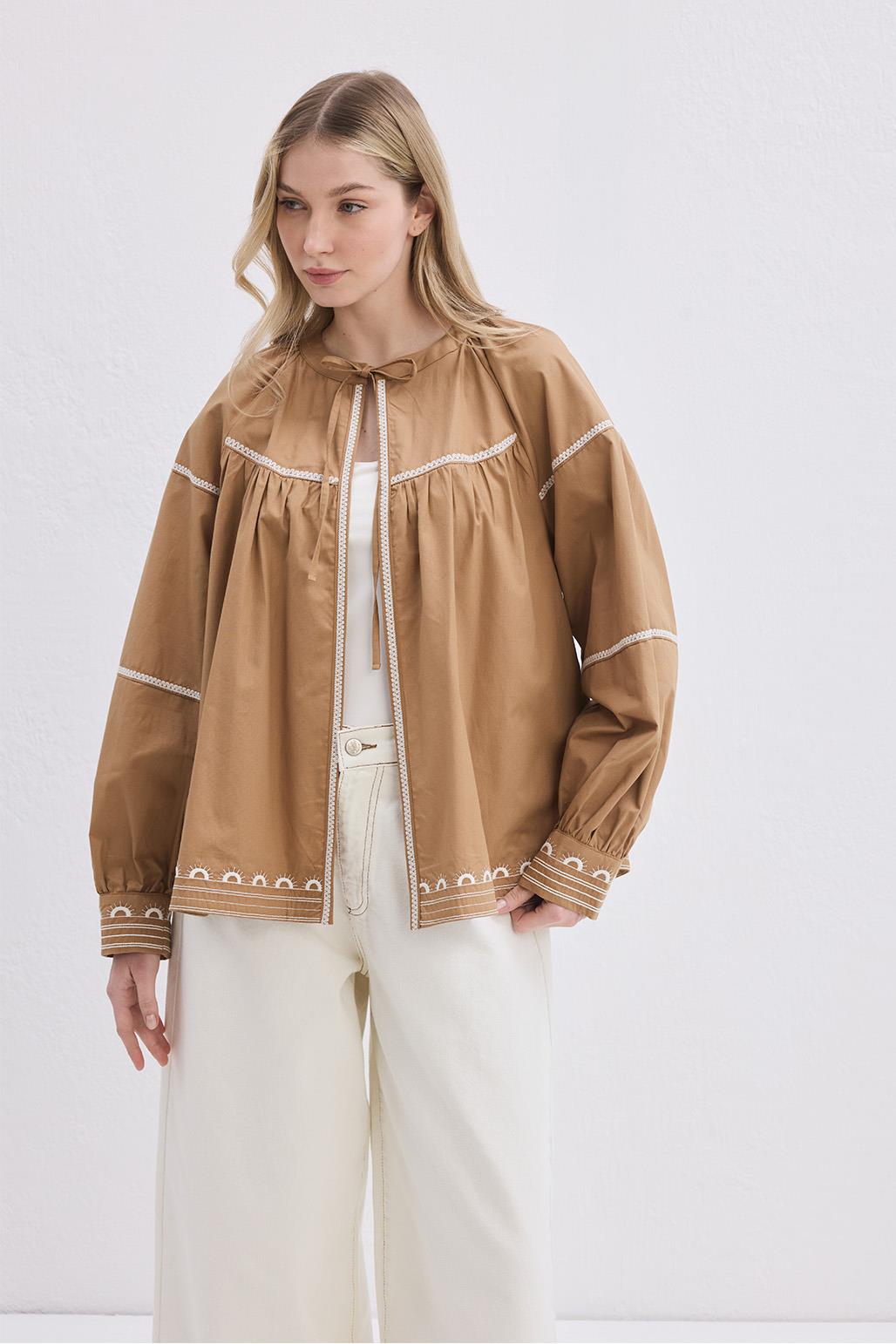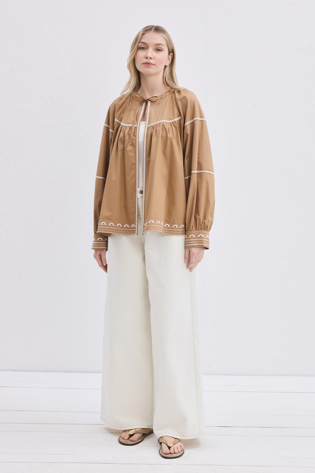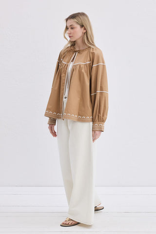 The Lova Embroidered Tie Shirt in Camel offers comfort and freedom of movement with its lightweight poplin fabric and raglan sleeve cut. The contrasting color embroidery details and bracelet cuffs add both elegance and a dynamic touch to this jacket. Perfectly versatile for summer, it can be styled for casual chic or more refined moments. Available in different color options, it adds a modern and stylish touch to your wardrobe, making it an essential piece you'll reach for again and again.
