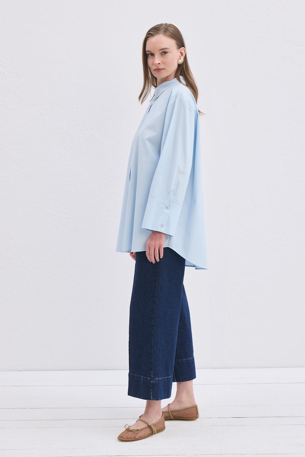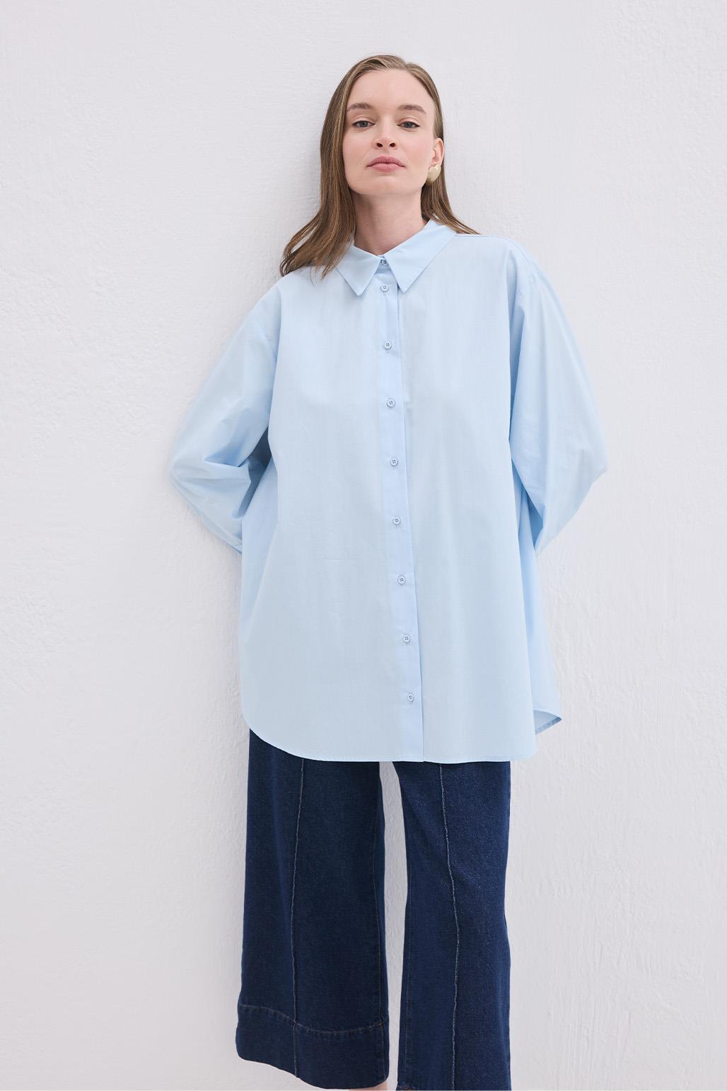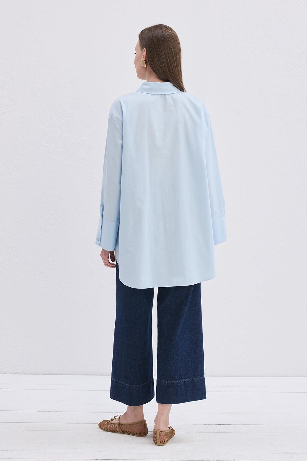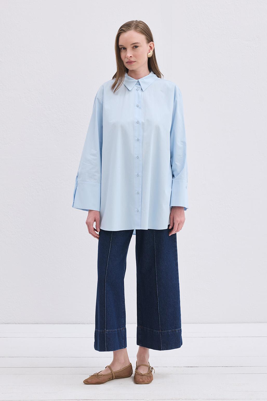 The Madelin Cuffed Shirt in Blue offers comfort and quality from the very first wear with its cotton-blend poplin fabric. Featuring a classic collar and button closure, it captures timeless elegance, while its wide cuffs add a unique and stylish touch. The oversized cut provides a modern, relaxed silhouette that effortlessly enhances everyday chic. Suitable for both office wear and social settings, this piece is a refined choice that elegantly highlights your personal style.